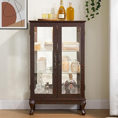 Glass Display Cabinet, China Cabinets with Glass Doors Lighted Curio Cabinet with 2 Tempered Glass Doors Mirrored Back Panel Adjustable Shelves Light Bulb Included for Home (Dark Cherry)