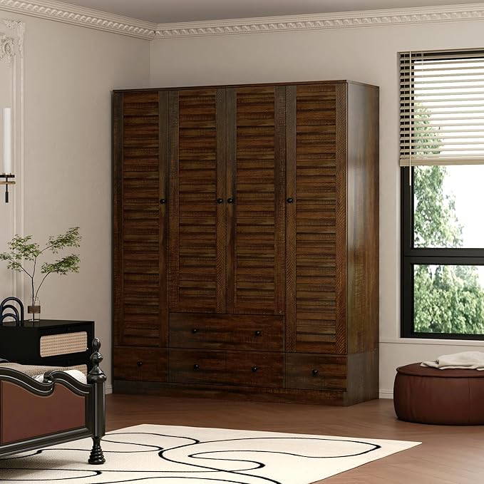 MOUMON 4 Shutter Door Wardrobe Armoire Closet with Shelves and 5 Drawers, Armoire Wardrobe Closet with 2 Hanging Rods, for Bedroom Brown (59Š—�W x 19Š—�D x 70.9Š—�H)