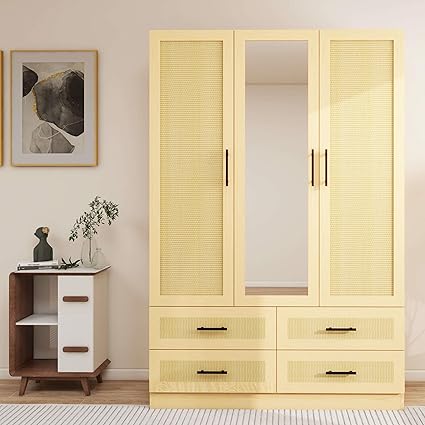 Rattan Wardrobe Closet with 3 Doors, 71"H Armoire Wardrobe Closet with Mirror, Clothes Cabinet Closet Wardrobe for Bedroom, Wooden Wardrobe Cabinet with Hanging Rod, Rattan Bedroom Armoires