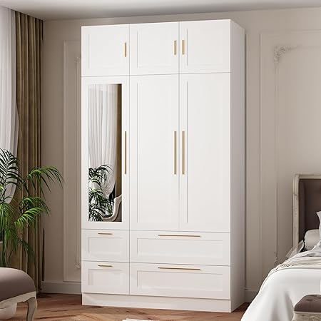 Wardrobe Armoire Closet with Mirror, 3 Door Wardrobe with Hanging Rod, 4 Drawers, Shelves, Modern Bedroom Armoire with Gold Handles, White Wardrobe Clothes Cabinet, 20.5Š—�D x 47Š—�W x 86.7Š—�H