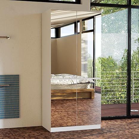 Wardrobe Closet with All Mirror, Wooden Armoire with 4 Doors & Hanging Rod, Clothes Storage Cabinet Organizer for Bedroom Apartment, White