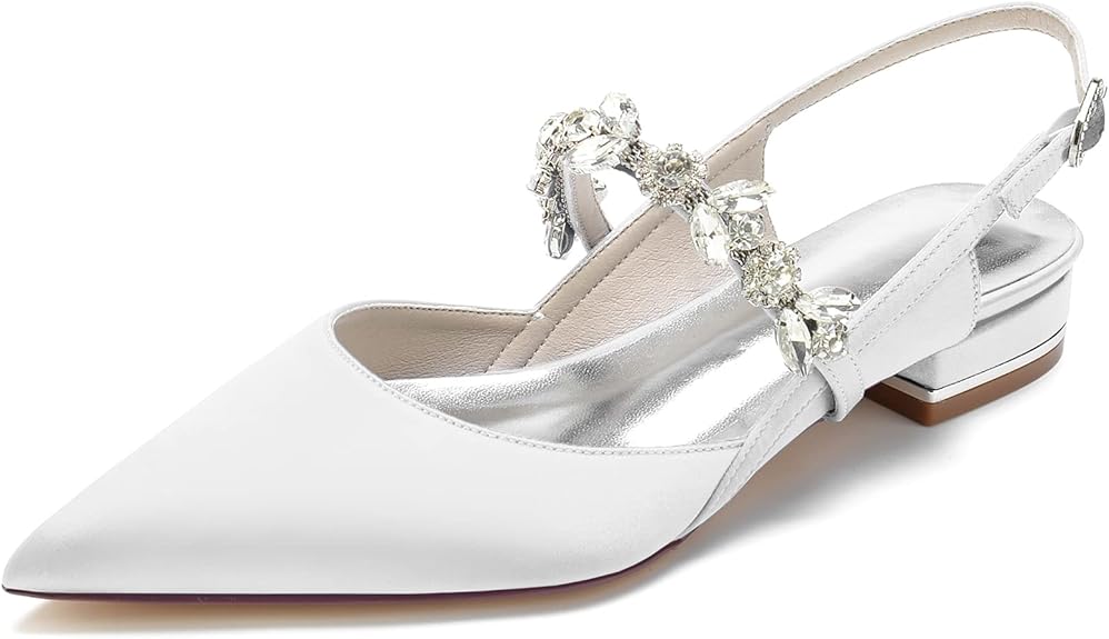 Women's Pointed Toe Satin Wedding Flats for Bride Comfortable Rhinestones Bridal Shoes Formal Closed Toe Slingback Flats Ballet Flats