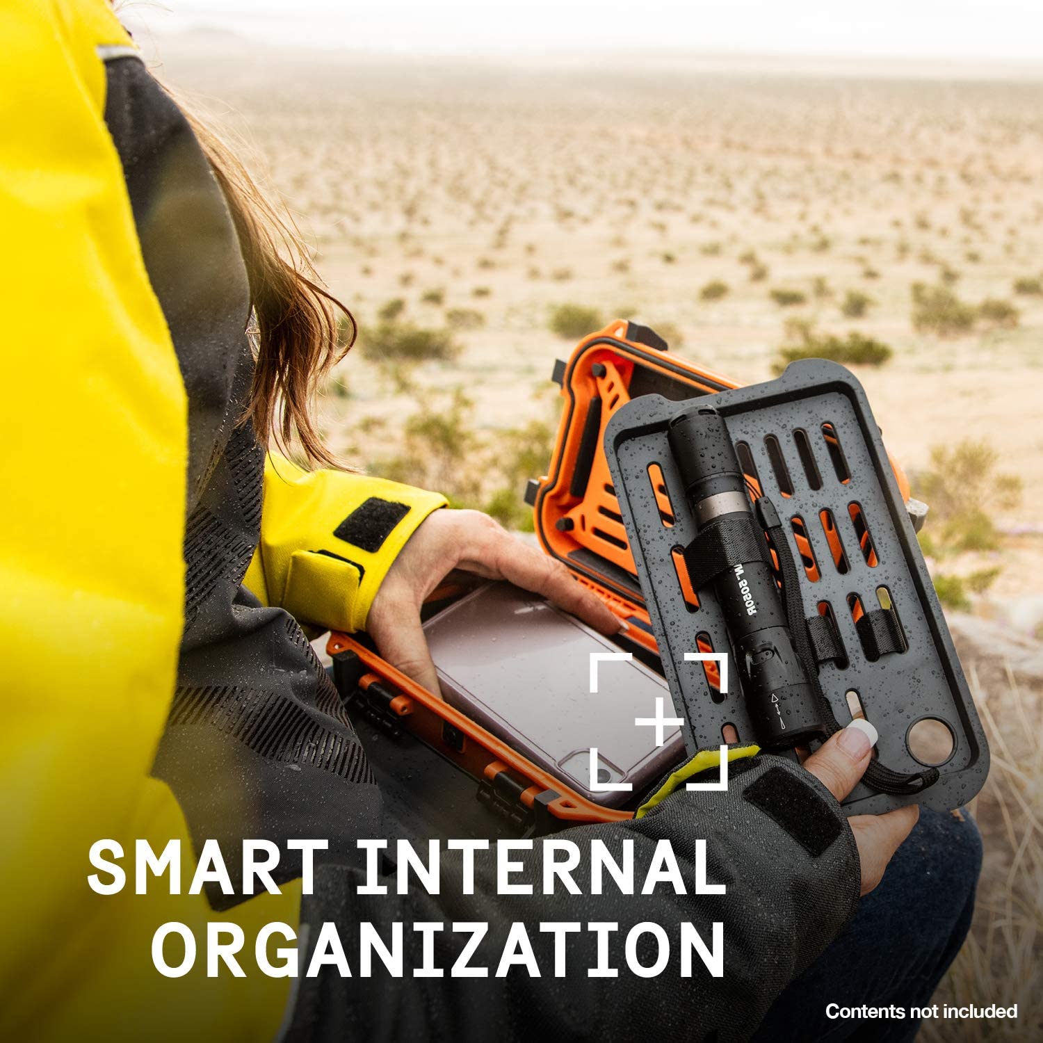 Rubberized protective bumpers, protects against drops. Snap in, flexible lid organizer. Rigid Divider Tray.