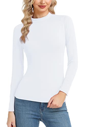 Qaffier Thermal Tops for Women Mock Neck Long Sleeve Fleece Lined Base Layer Tee Shirt White Small