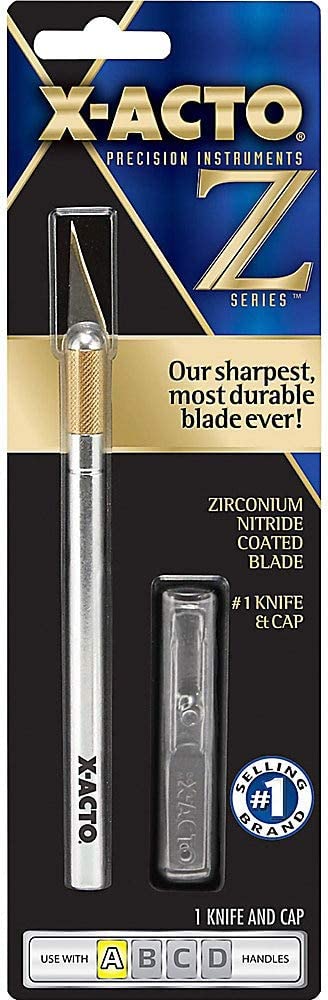 X-Acto knives are designed for maximum performance and precision. Always on the cutting edge, for decades X-Acto has been the standard by which other cutting blades are measured. The X-Acto Z Series features our sharpest, most durable blade ever. Zirconium nitride coated blade provides an edge that is proven to be 5 times stronger and stays sharp 7-10 times longer than standard blades. Does an incredible job with delicate, precision cutting or trimming or stripping on paper, plastic, balsa, thin metal, cloth, acetate and other materials. A lightweight aluminum handle with easy-change blade. Includes No.1 knife and cap.