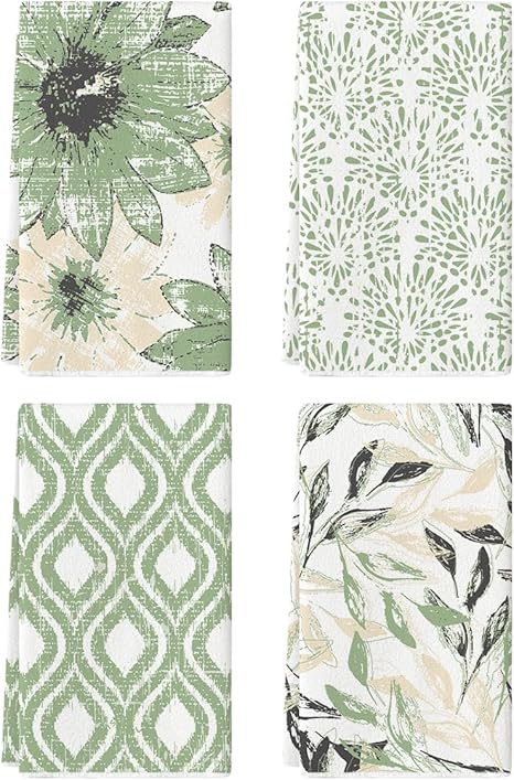 Artoid Mode Green Floral Leaves Boho Kitchen Towels Dish Towels, 18x26 Inch Seasonal Spring Summer Decoration Hand Towels Set of 4