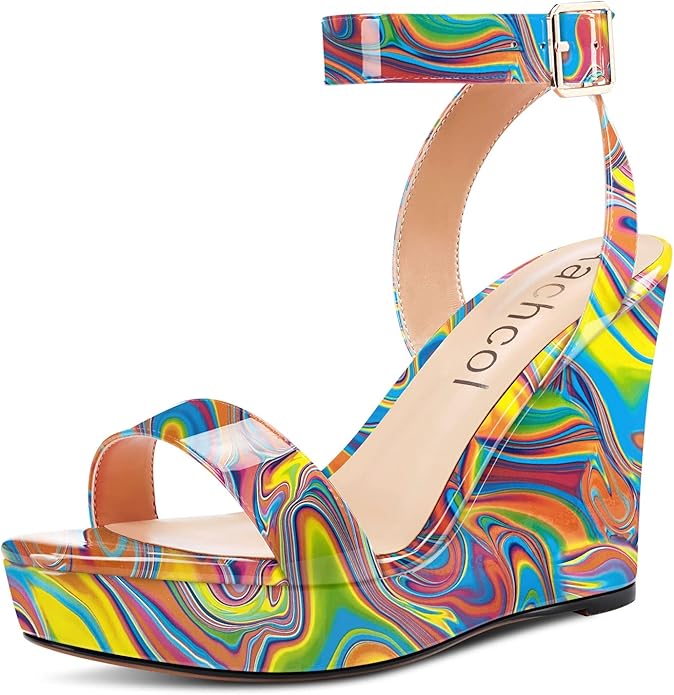 Aachcol Women Platform Wedge Sandals Round Peep Open Toe Ankle Strap Slingback Two-Piece Chunky Block High Heel Dress Shoes Pumps Party Patent 4 Inch