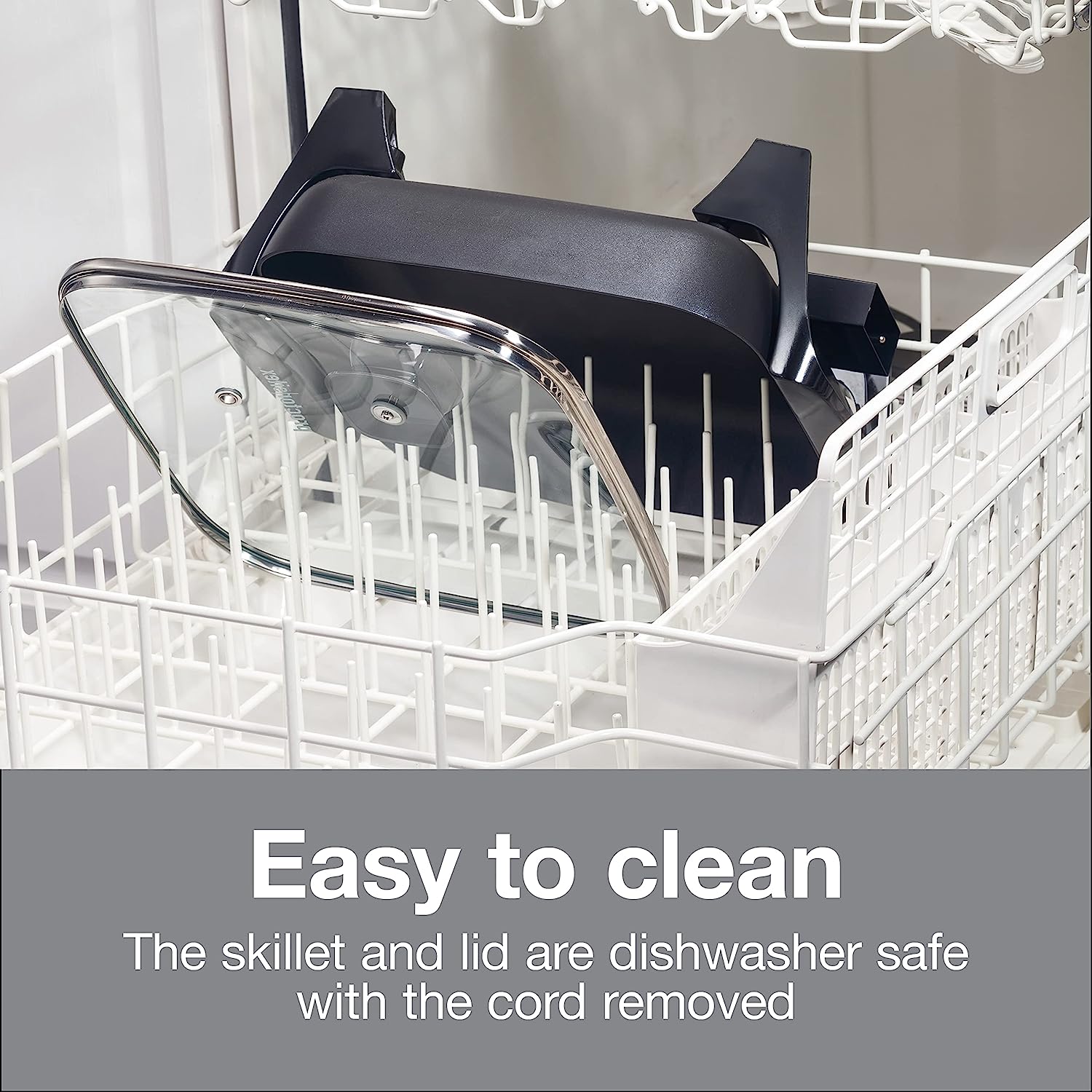 • Easy To Clean: Once the cord has been removed, the electric skillet and lid can go right in the dishwasher for easy cleanup. The nonstick surface and lid easily wash clean in soapy water.