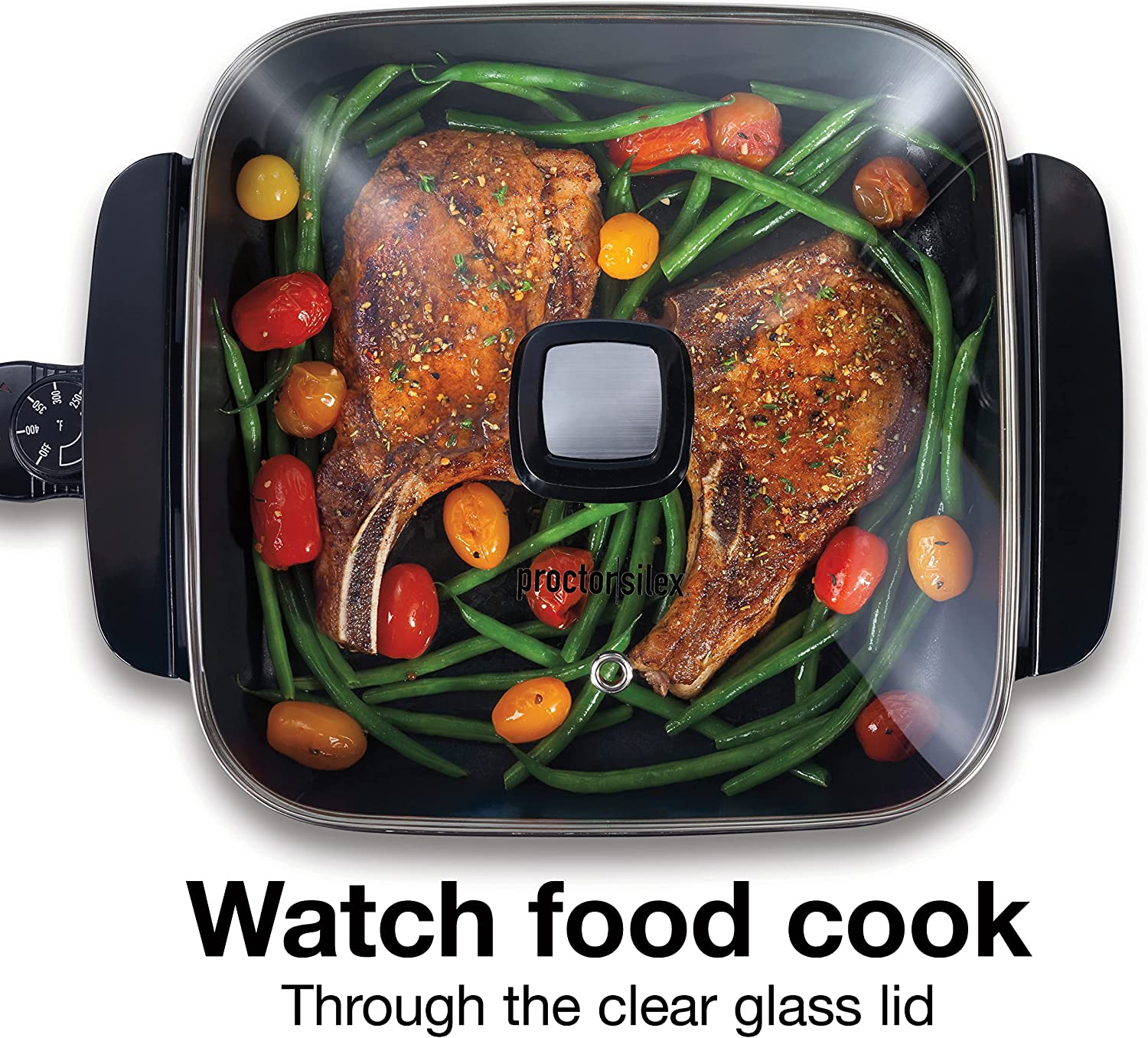 Proctor Silex Electric Skillet with Lid, 116 sq. in. Nonstick Cooking Surface for Frying, Sauteing, Simmering and Braising, Adjustable Temp 200° to 400° F, Black (38526PS)