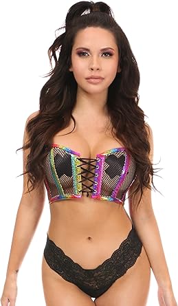 Daisy corsets womens Lavish Rainbow Pvc Glitter & Fishnet Lace-up Short Bustier TopBustier