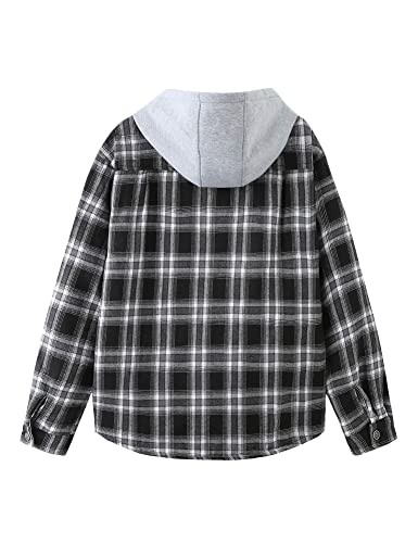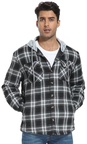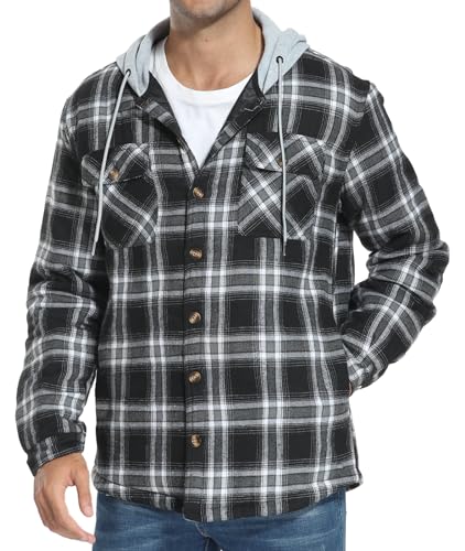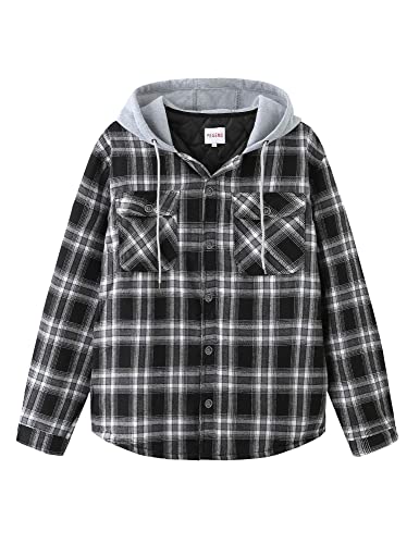 PEGENO Men's Long Sleeve Plaid Button Quilted Lined Flannel Shirt Jacket with Hood(Black Grid-US Large)
