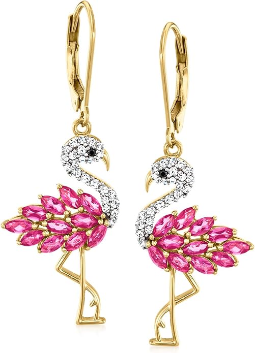 Ross-Simons 1.60 ct. t.w. Pink Topaz and .40 ct. t.w. White Zircon Flamingo Drop Earrings With Black Spinel Accents in 18kt Gold Over Sterling