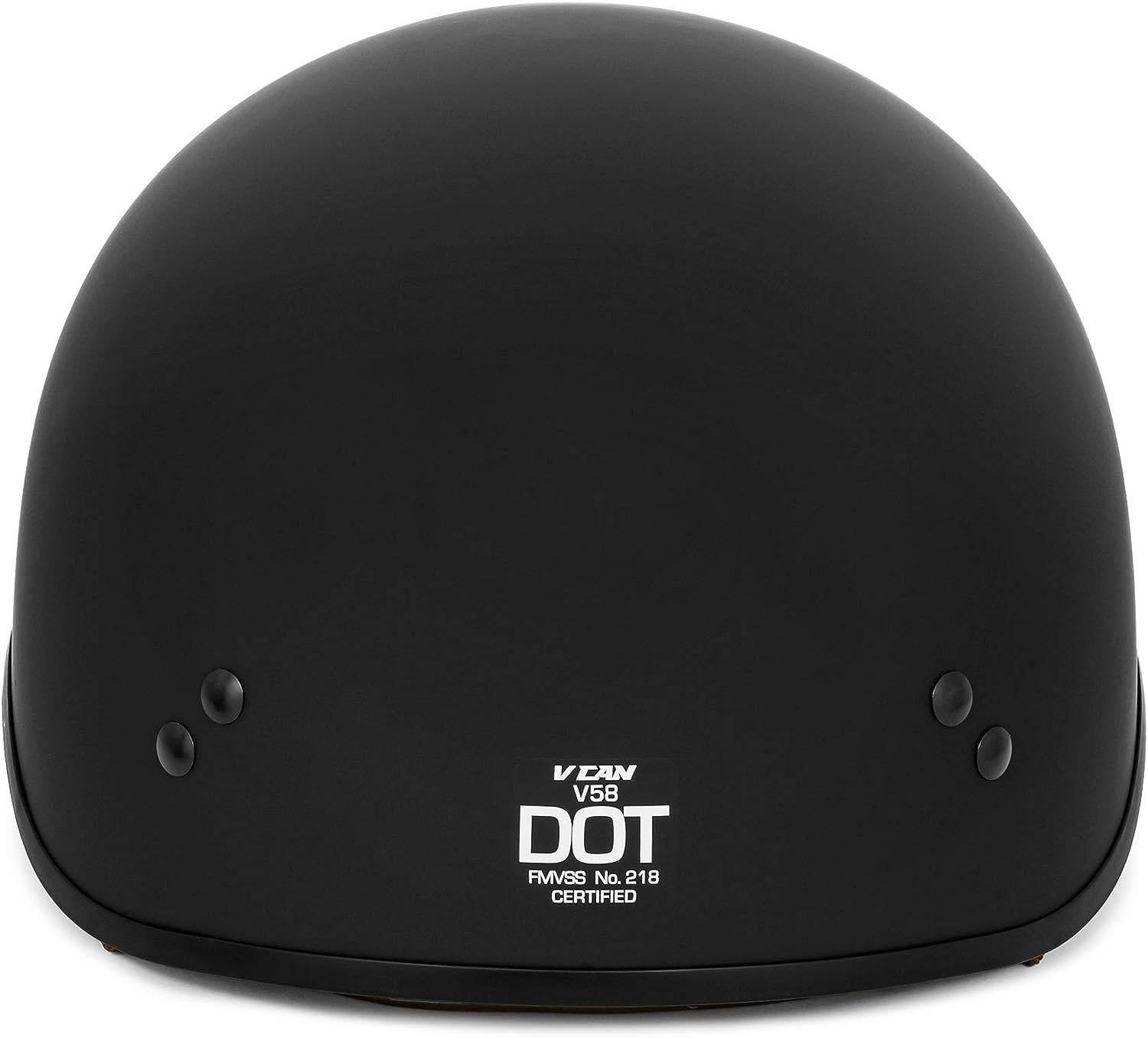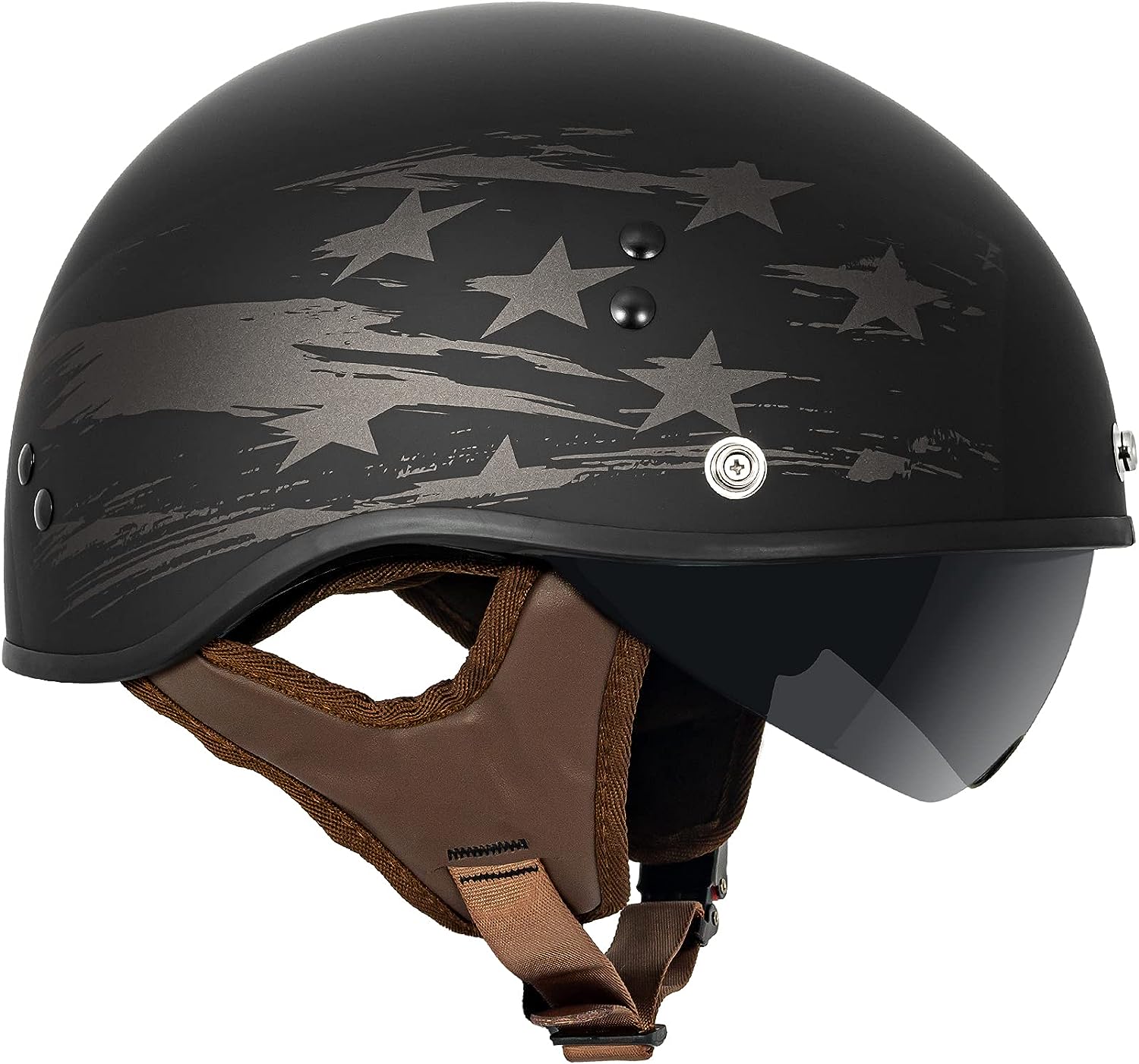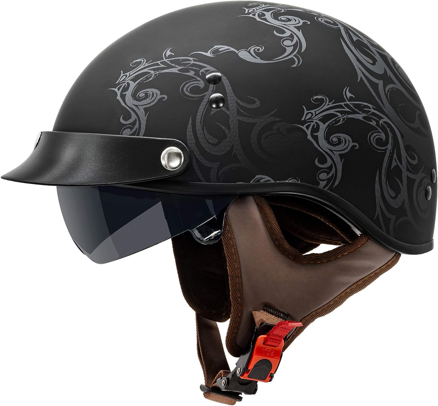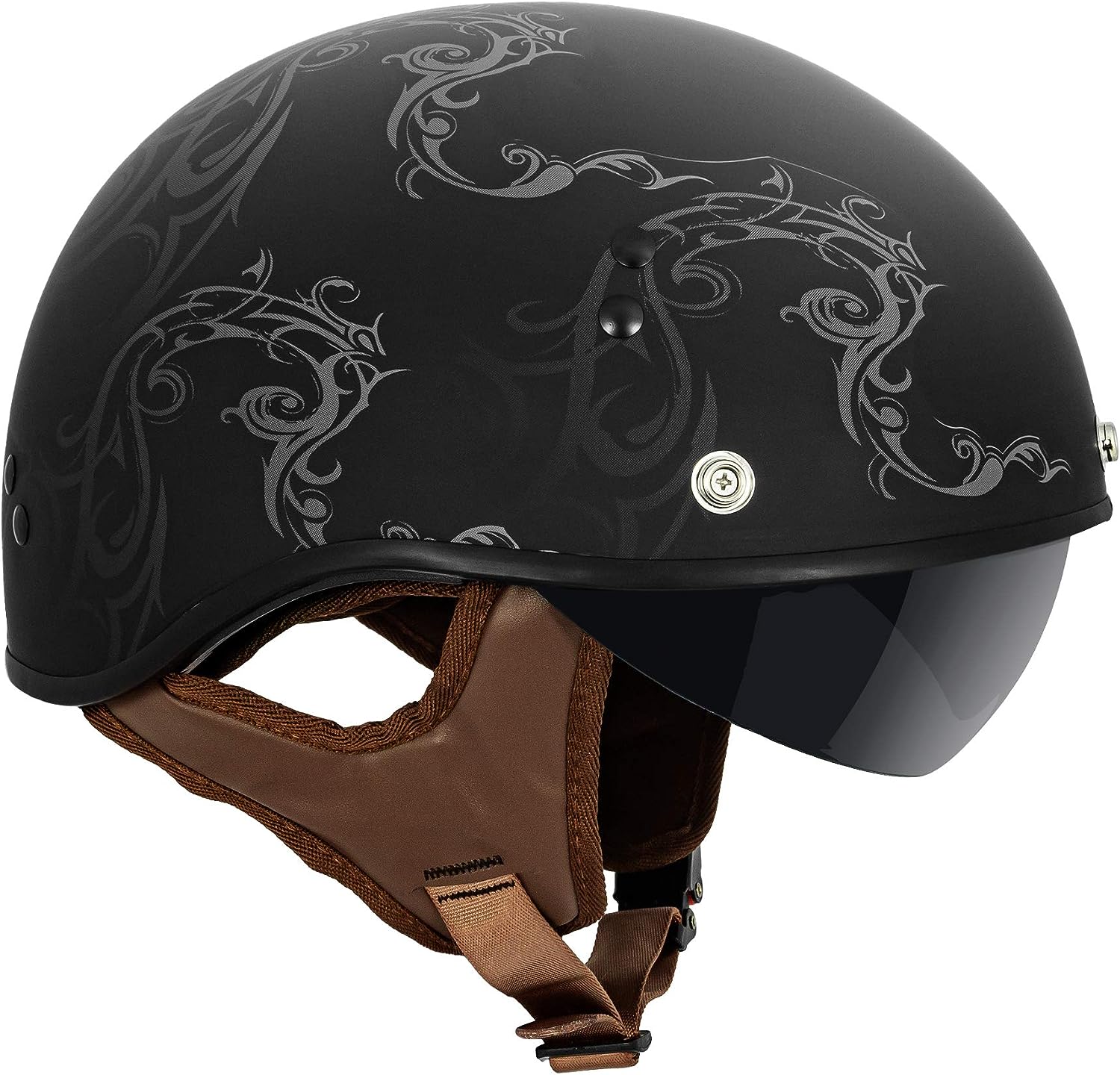 VCAN Cruiser Solid Flat Black Half Face Motorcycle Helmet with Drop-Down Sun Visor, Removable Peak and Quick Release Buckle