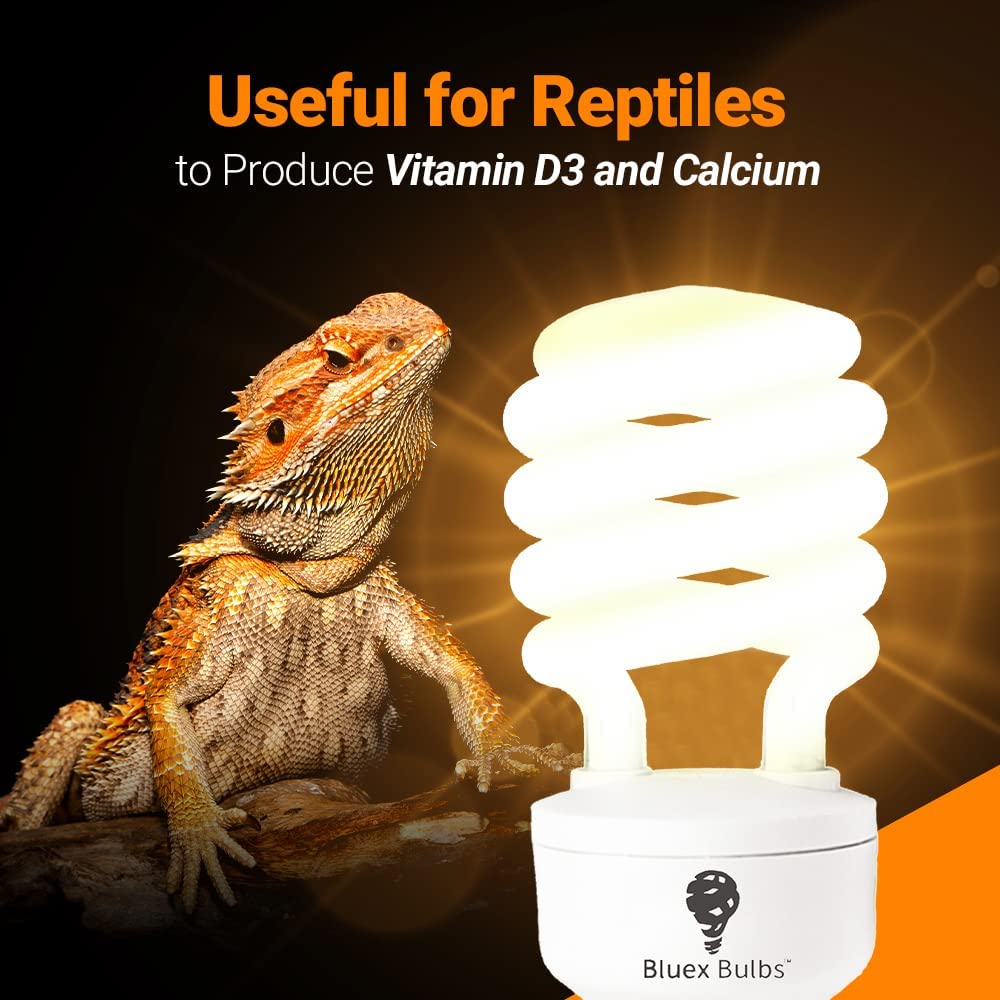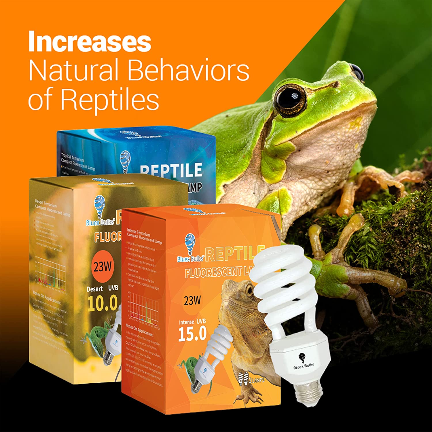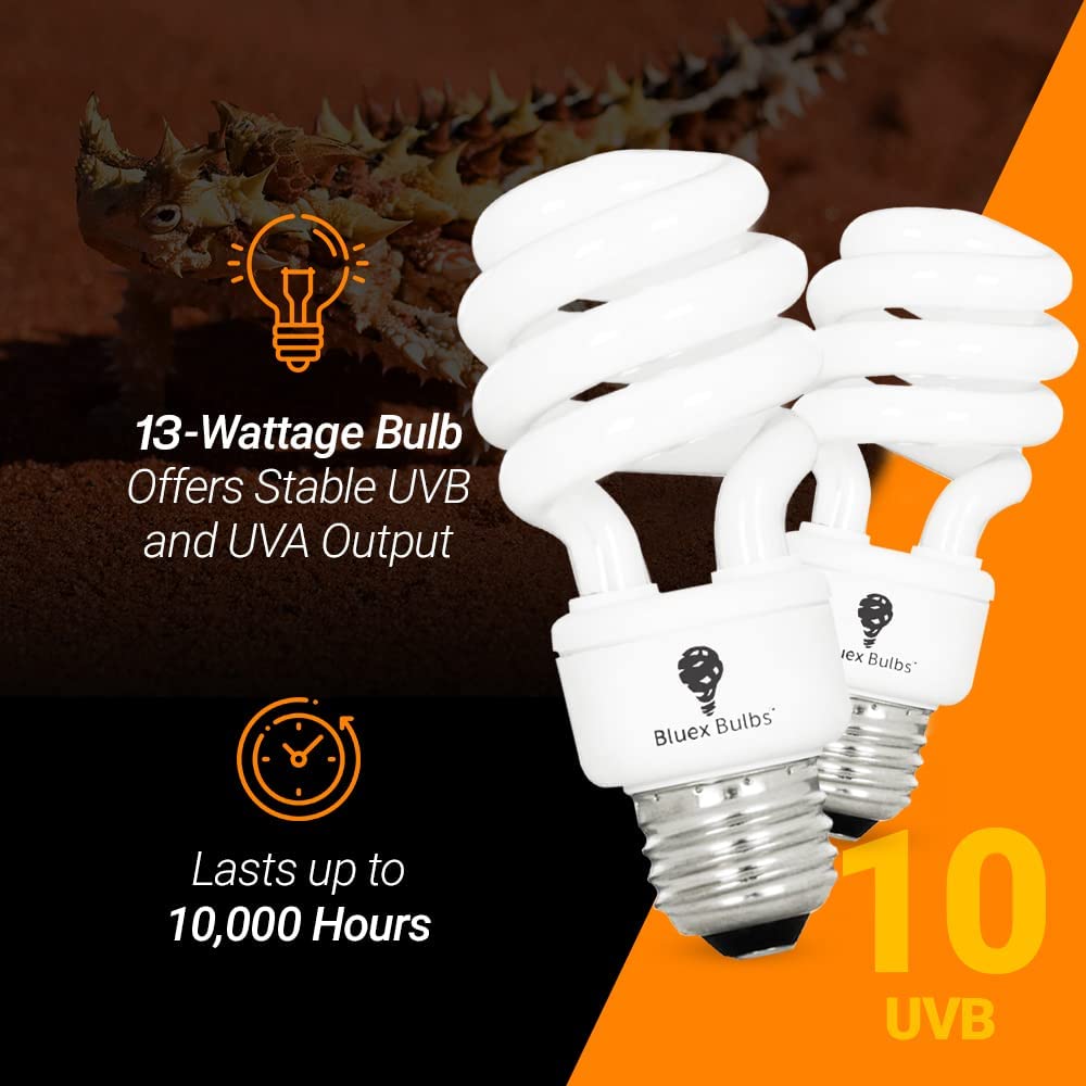 • Regulates Behaviors. Bluex Bulbs 13-Watt Desert CFL 10.0 UVB Light Bulbs for Reptile also provide the necessary UVA light which helps to regulate natural behaviors, including feeding, daily activity and movement, mating and similar activities.