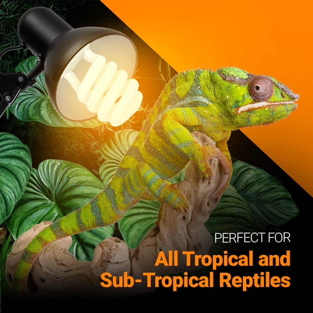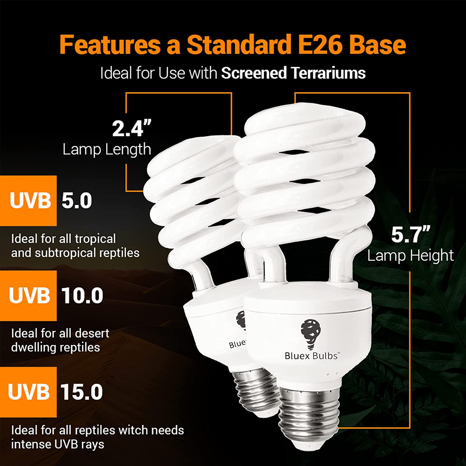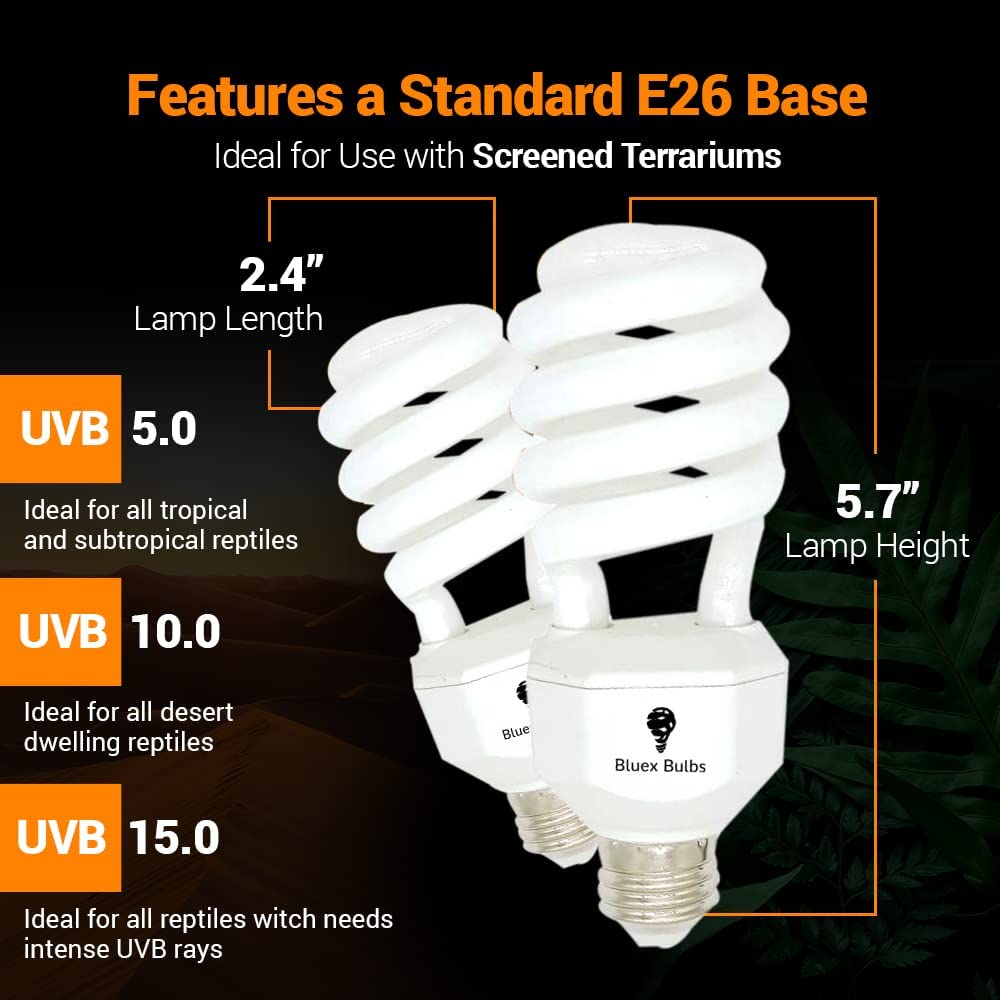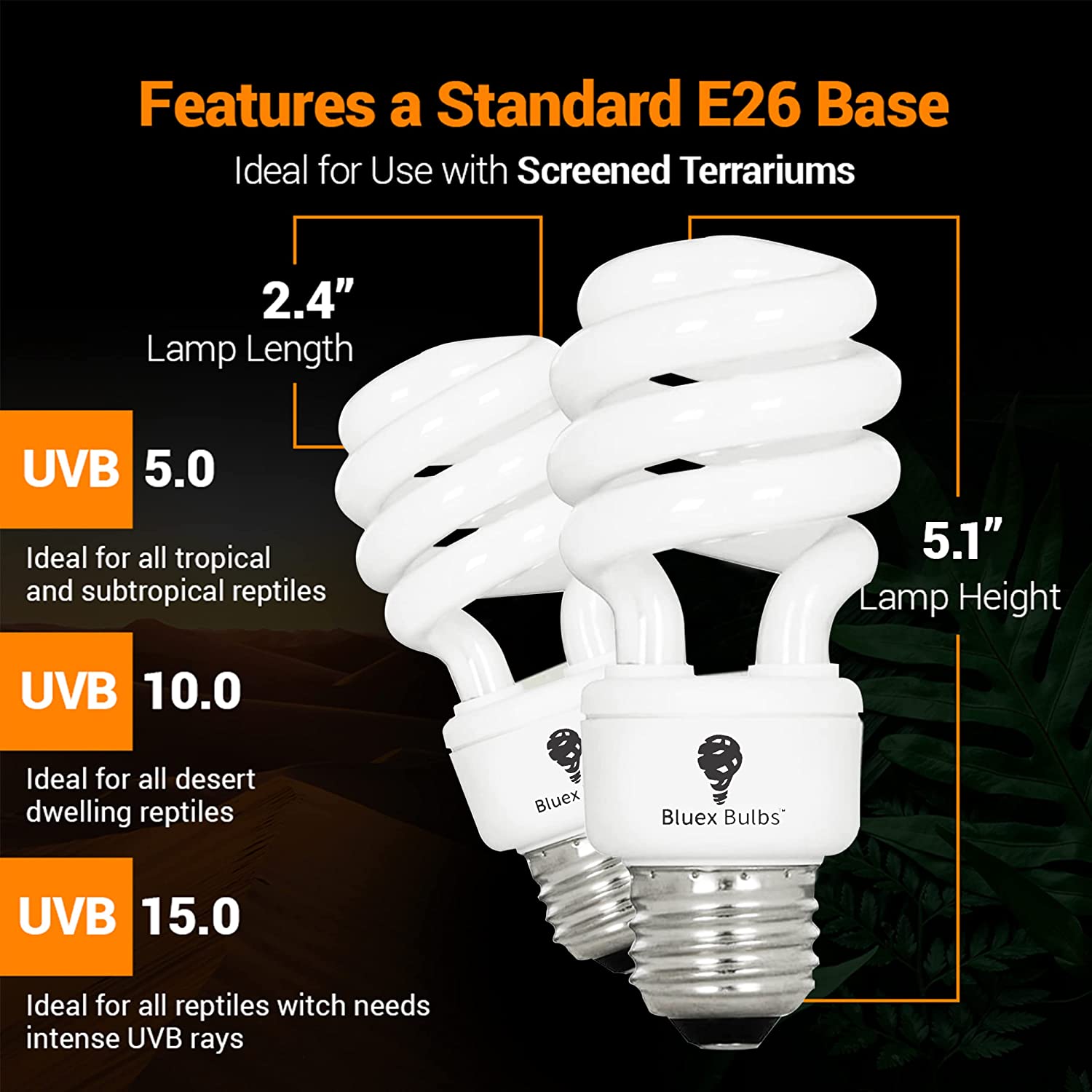 • High Performance. Easy to install with an e26 base, each 13-Watt Desert UVB 10.0 CFL Reptile UVB Bulb offers stable UVB and UVA output with no harmful UVC output. Always keep your lamp at least 15 cm away from your reptiles.
