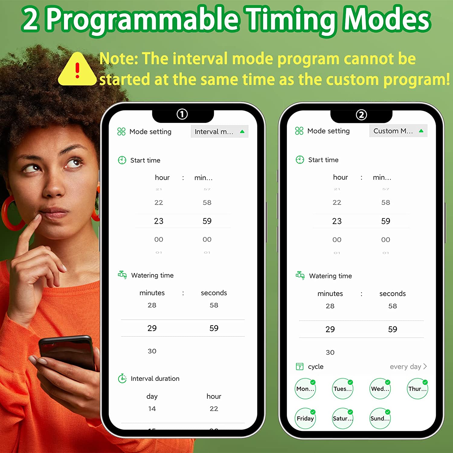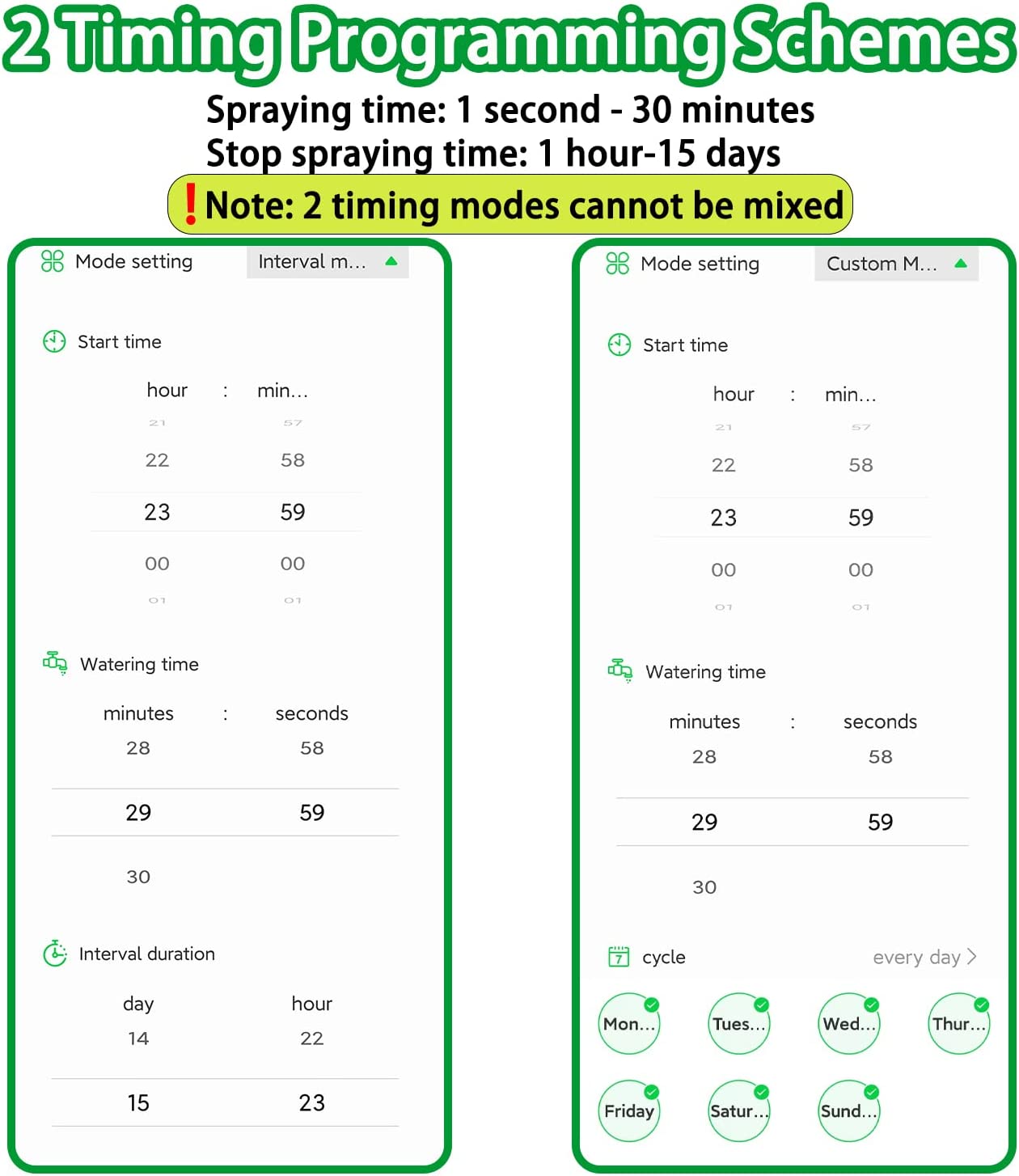 • 🐸【Reptile Humidifiers Cycle Timing System】Reptile humidifier timing program has [interval mode] and [custom mode], interval mode can set start time, spray duration (1 second-30 minutes) and interval time (1 hour-15 days). [Custom mode] The reptile mister host can be set to any time of any day in 7 days from Monday to weekend, and up to 10 custom timer programs can be added. Note: Circulation mode and self-definition mode cannot be used at the same time.