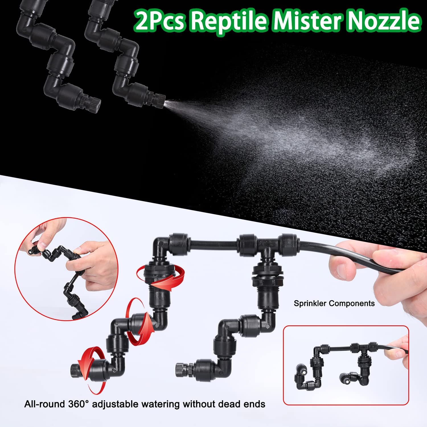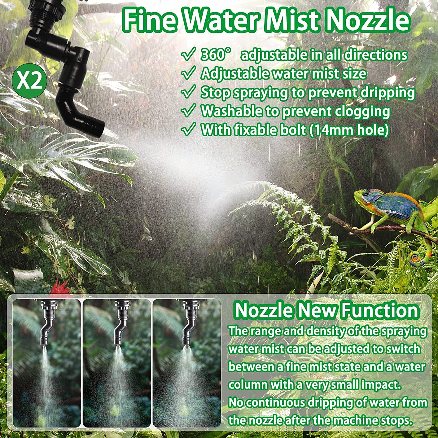 • 🐌【360°Rotating Nozzles】This reptile misting system is equipped with 2 360° all-way adjustable spray nozzles, which can be easily adjusted to any angle of the spray, allowing a fine mist to be sprayed to every corner of the reptile terrariums. Each misting nozzle has a spray flow rate of 120-160 ml per second, which makes our reptile mister more efficient compared to traditional reptile fogger.