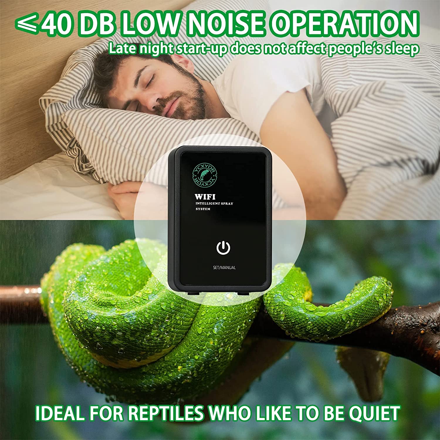 • 🌱【Reduce Terrarium Mister Working Noise】Compared to the previous generation of SMART reptile mister, we also realized that the sound made by the machine when running was unacceptable to everyone. Therefore, the new reptile mister pump has an additional circle of silent cotton around the pump and 4 soft pads on the back of the machine.The noise has been reduced a bit, but it is still not recommended to start at night in the bedroom to avoid disturbing your rest.