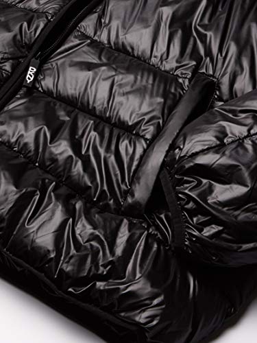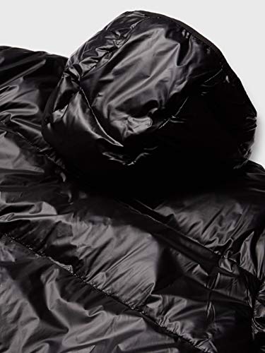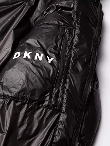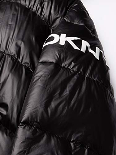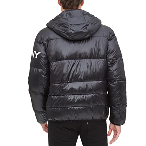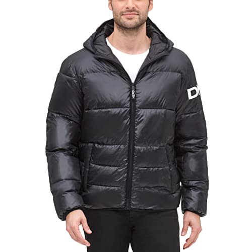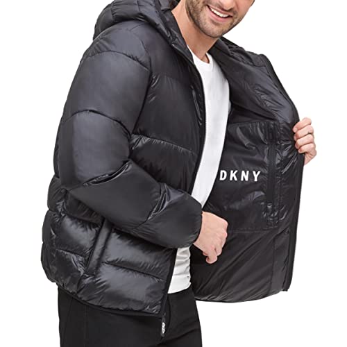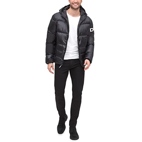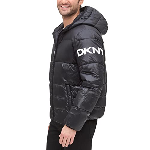DKNY Men's Water Resistant Ultra Loft Hooded Logo Puffer Jacket, black, Large