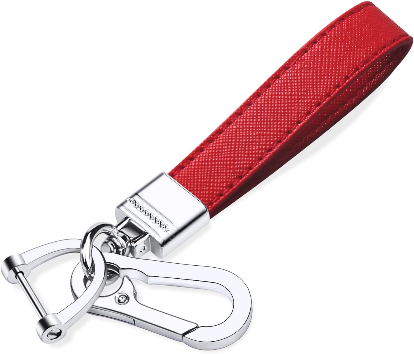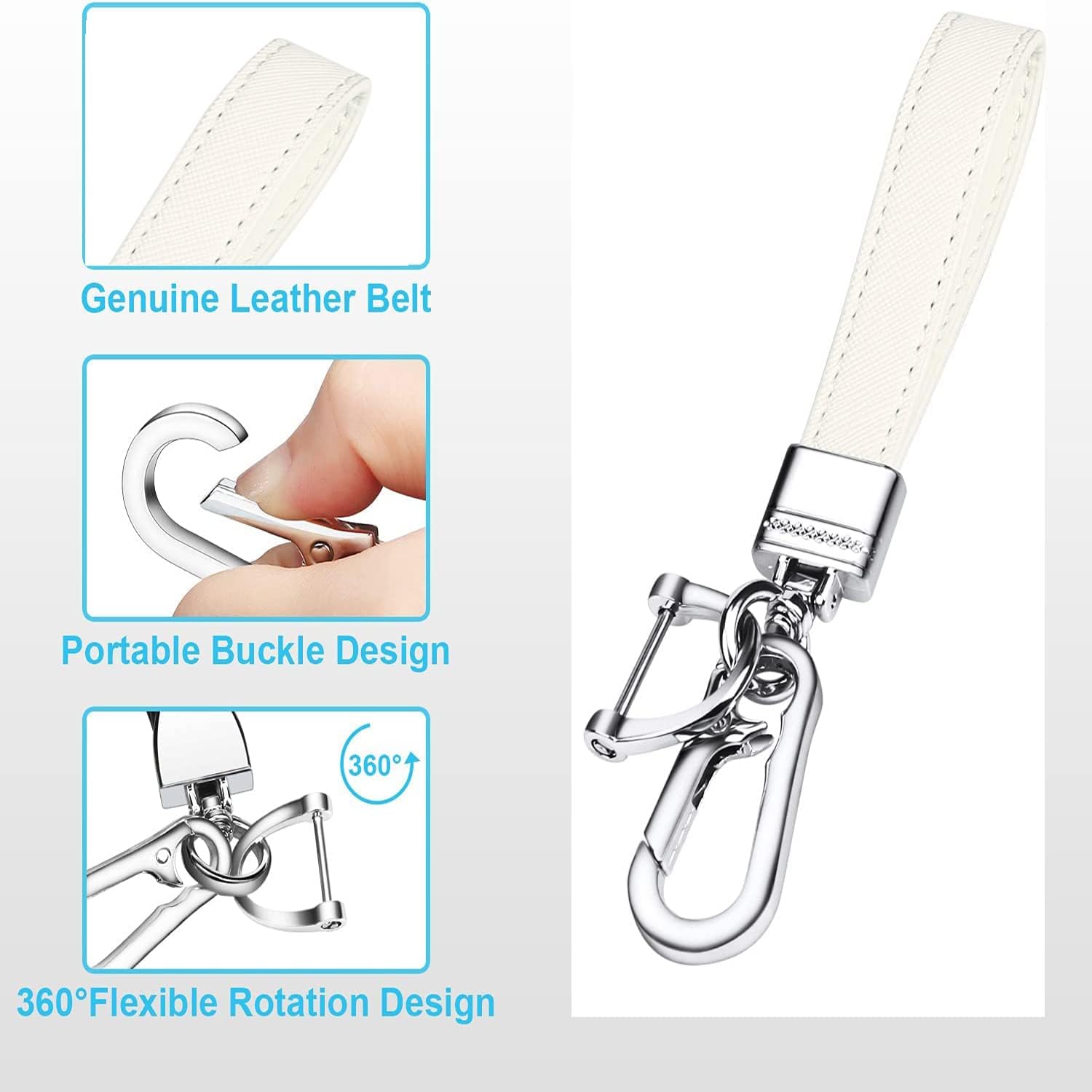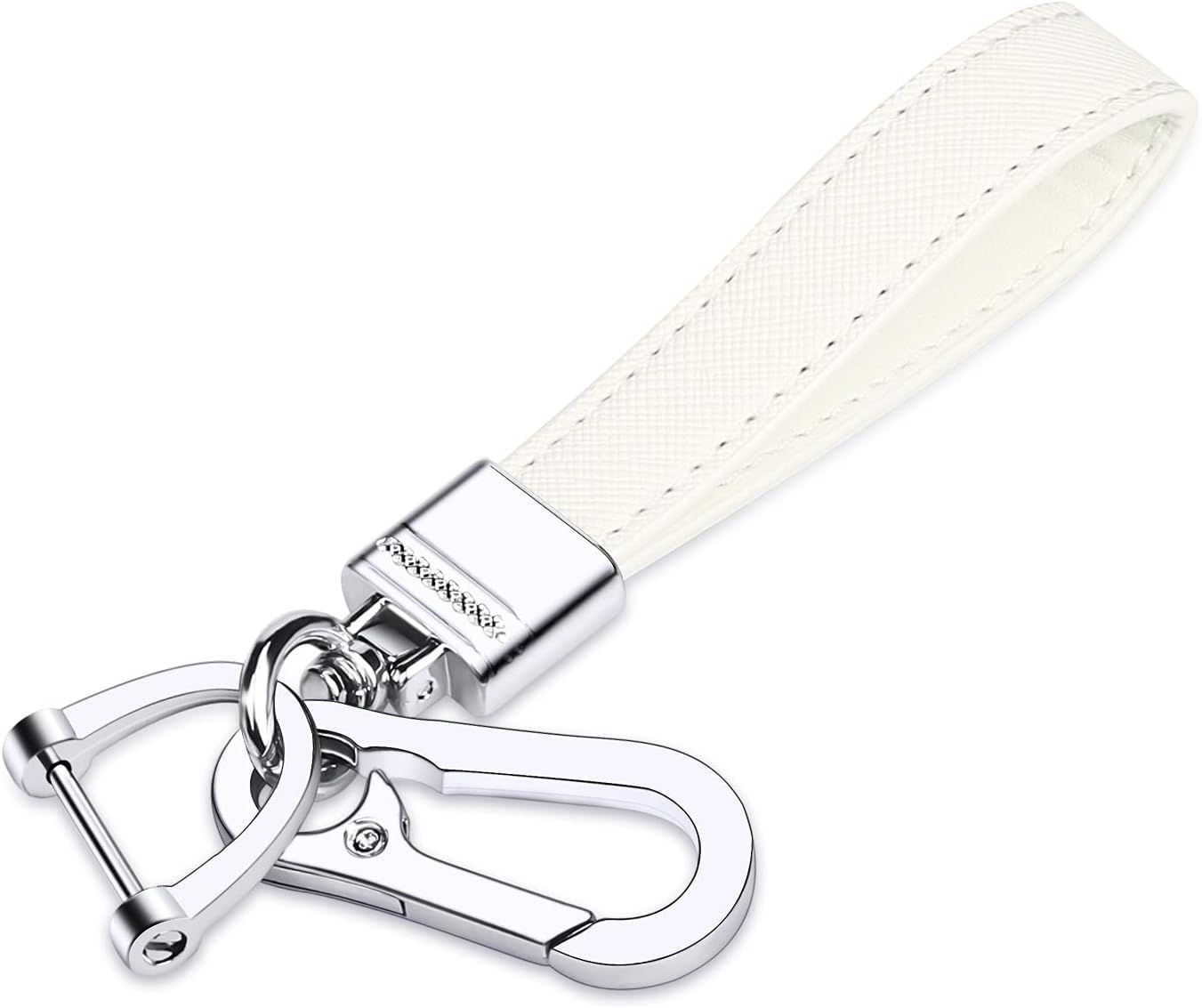 QBUC Genuine Leather Car Keychain,Universal Heavy Duty Metal Key Chain Accessories,Car Fob Key Keychain Holder with 360 Degree Rotatable Snap Swivel and Anti-Lost D-Ring for Men Women(White)