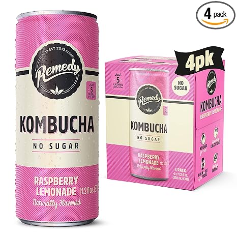 Remedy Kombucha Sugar Free Organic Drink, Low Calorie, Probiotic Like Tea for Gut Health - Raspberry Lemonade - 11.2 Fl Oz Can, 4-Pack