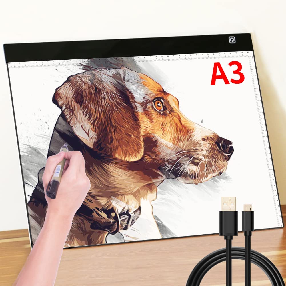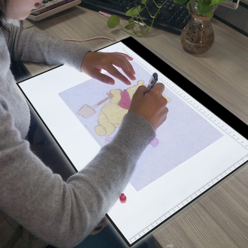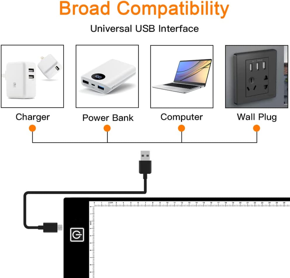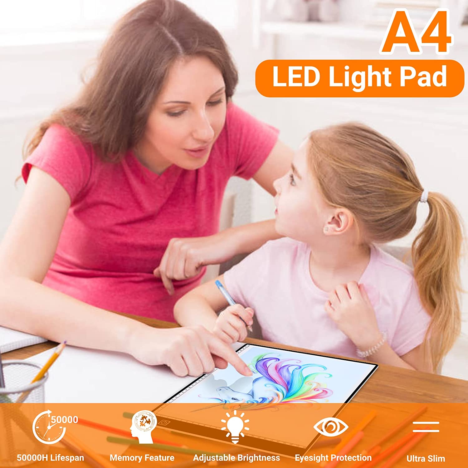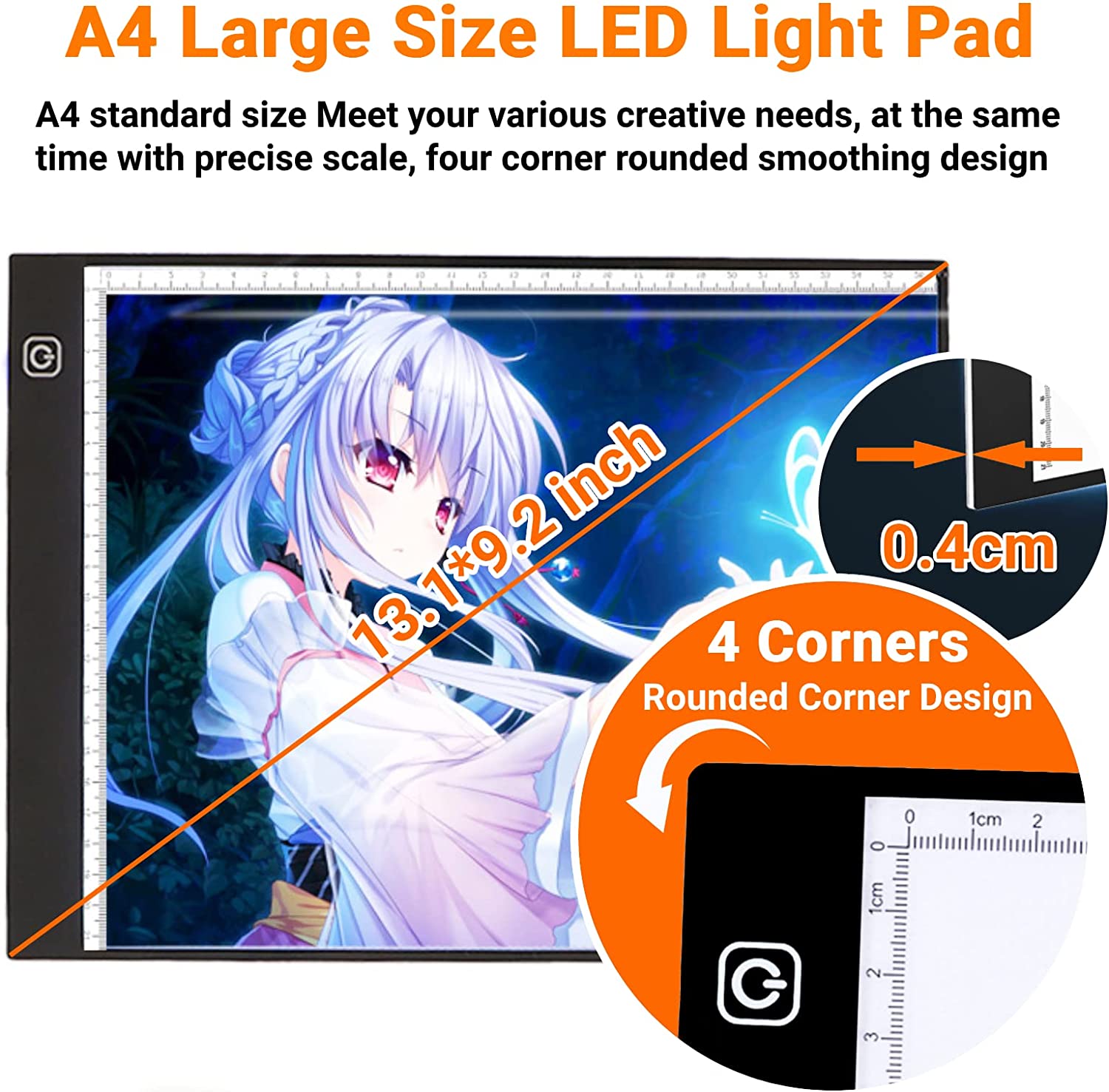 • ✅ PRECISION DESIGN&QUALITY FIRST-Our acrylic material A4 light pad is durable,anti-slip and drop-proof,with smooth rounded corners on the four corners,making it safer for you and your family to use! The light table has a scale and is equipped with a USB port data cable that can be used through any plug,which is convenient to use.