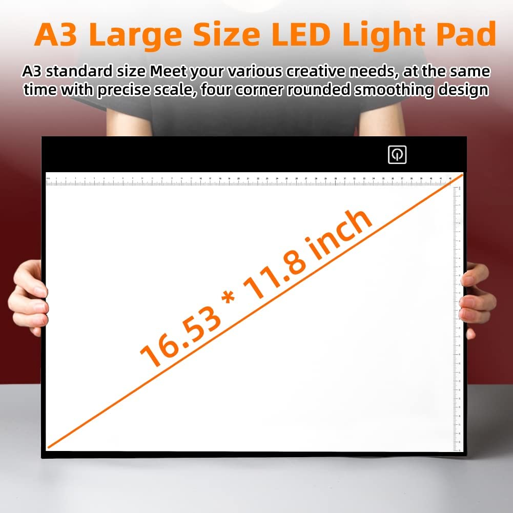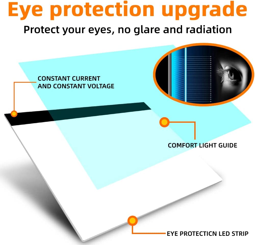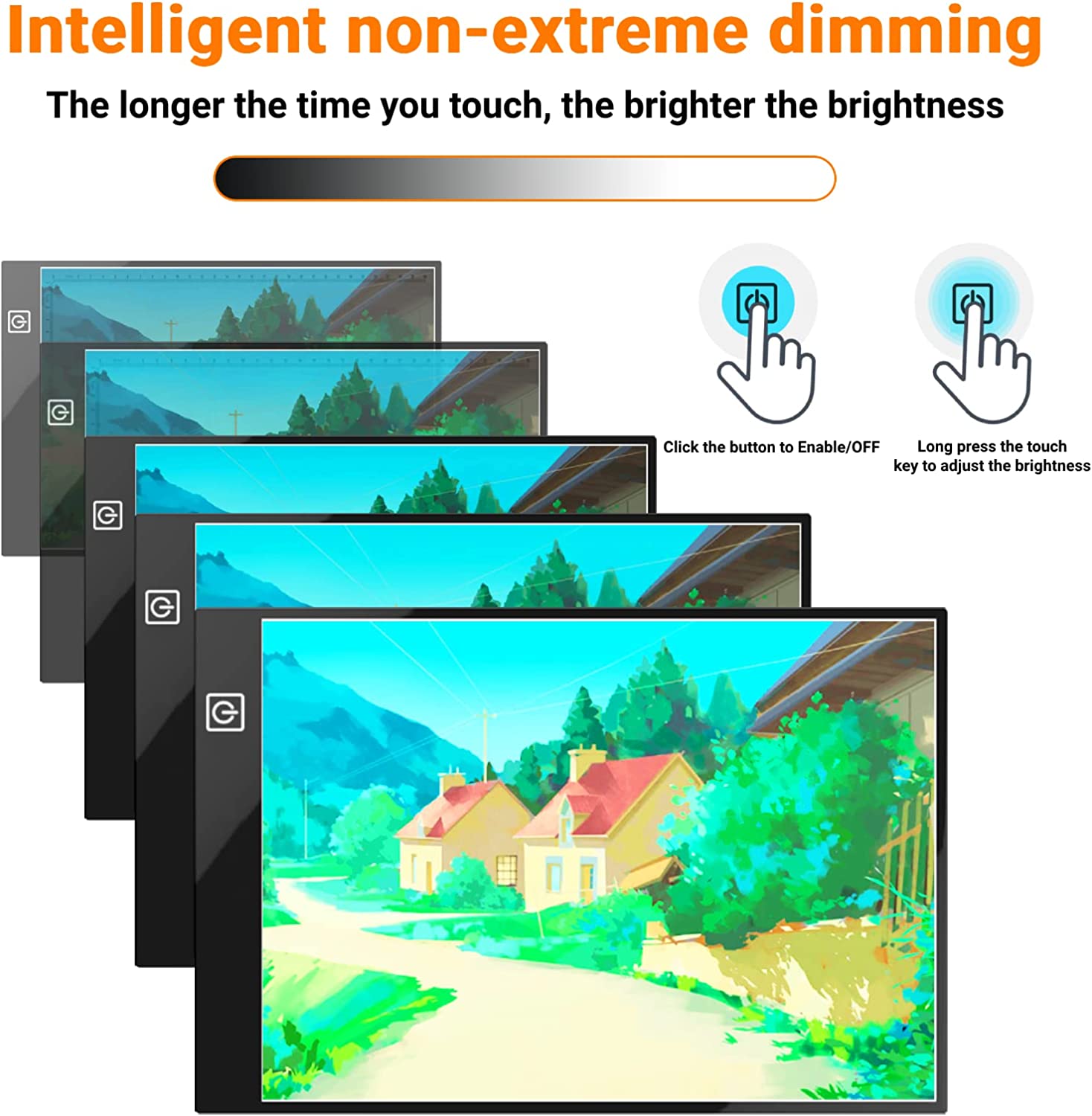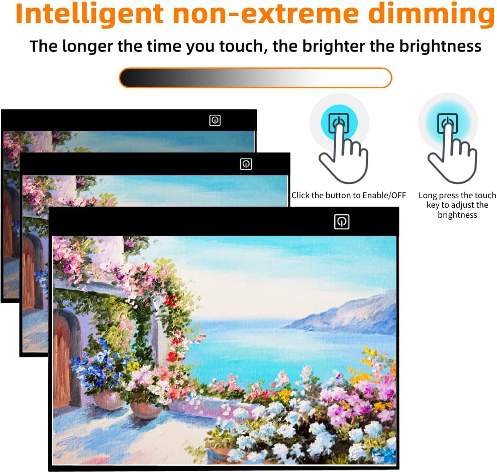 • ✅ NEW UPGRADE,STEPLESS ADJUSTABLE-Flicker-Free super bright eco-friendly Led,Touch sensor Switch Design, turn on/off and brightness control easily just by slight touch.The light box for tracing is uniform and there is no glare radiation,which can effectively relieve eye fatigue,and there is no more pain after working for a long time.