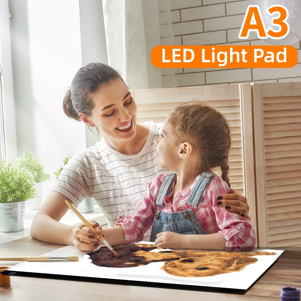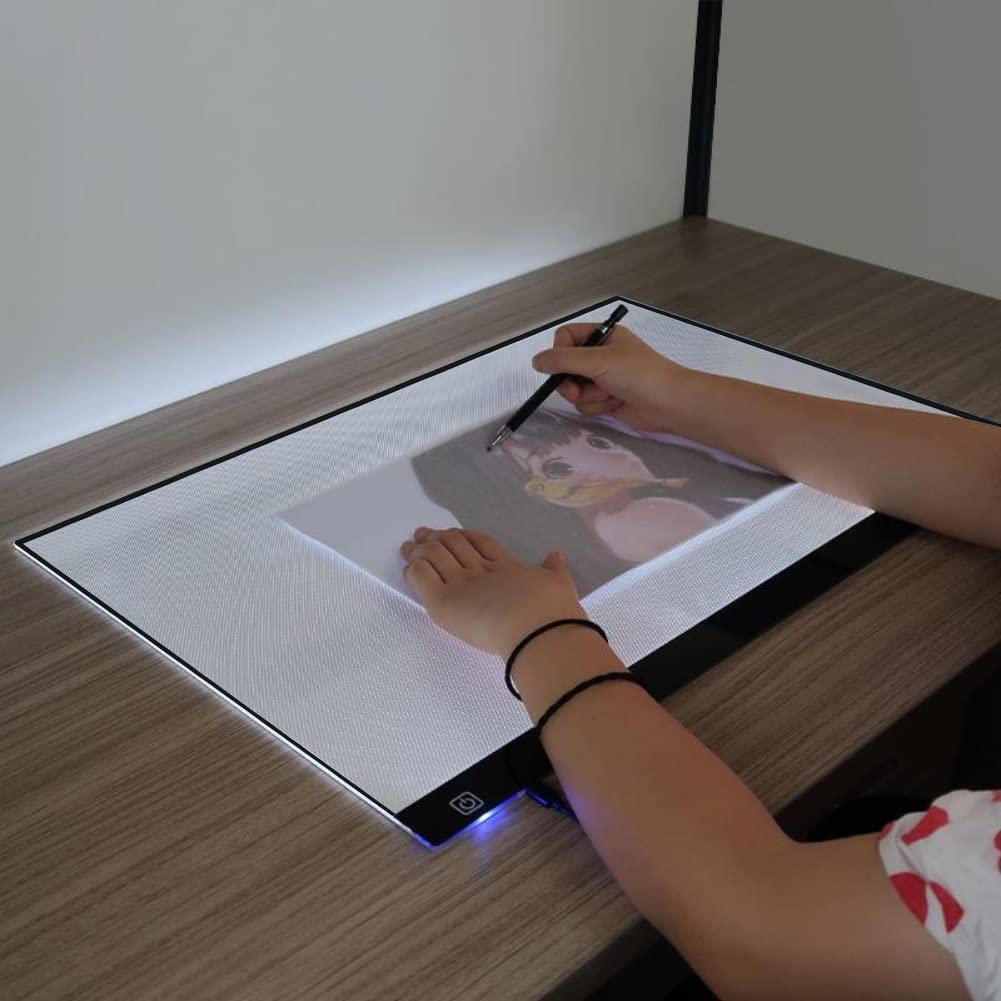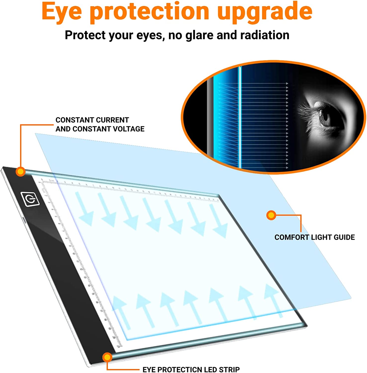• ✅ NEW UPGRADE,STEPLESS ADJUSTABLE-Flicker-Free super bright eco-friendly Led,Touch sensor Switch Design, turn on/off and brightness control easily just by slight touch.The light box for tracing is uniform and there is no glare radiation,which can effectively relieve eye fatigue,and there is no more pain after working for a long time.