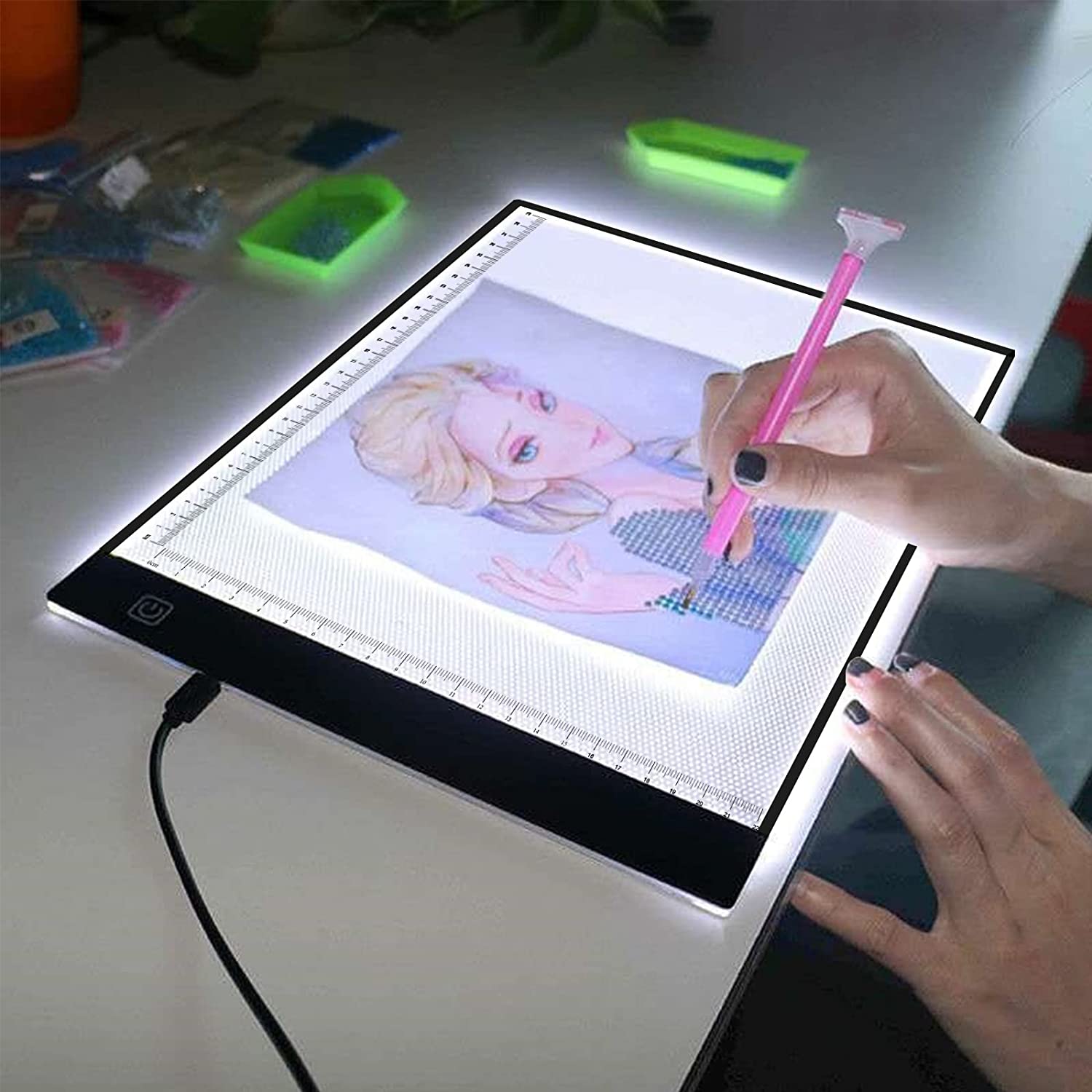 • ✅ PORTABLE & ULTRA SLIM-The dimension of the A4 diamond art light pad is 13.1*9.2*0.15inch,Light weight and only 4mm thickness,easy to carry. The lighting is perfect and super bright,giving you unlimited creativity.