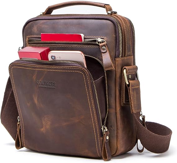 Hiram Men's Crazy Horse Cow Leather Messenger Bag, Crossbody Bag for Men, 25.5 cm x 21.5 cm x 10.0 cm, Coffee