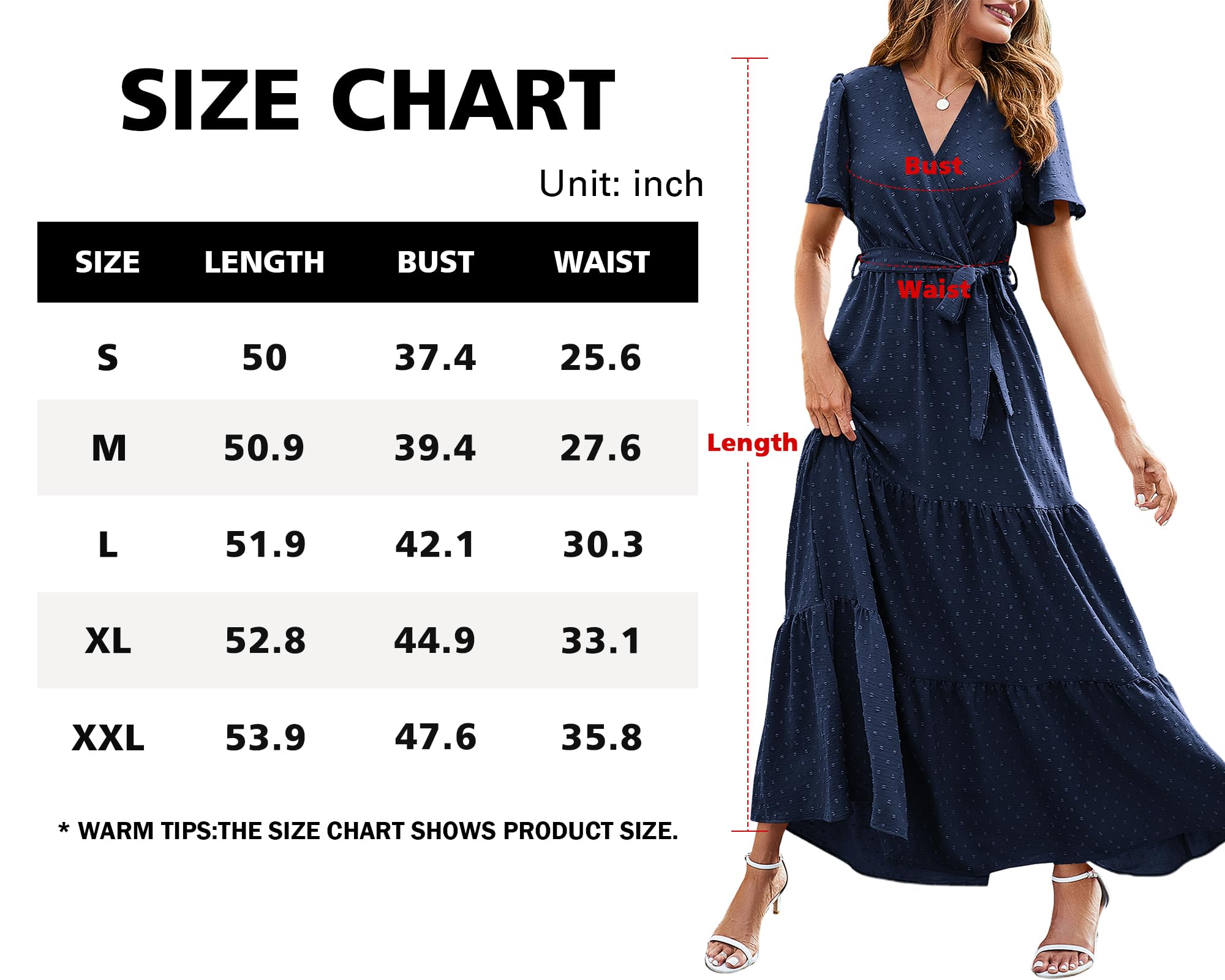 MASCOMODA Women Boho Swiss Dot Maxi Dresses Wrap V Neck Flutter Short Sleeve Solid Tie Waist A Line Tiered Flowy Long Dresses(Navy,X-Large)