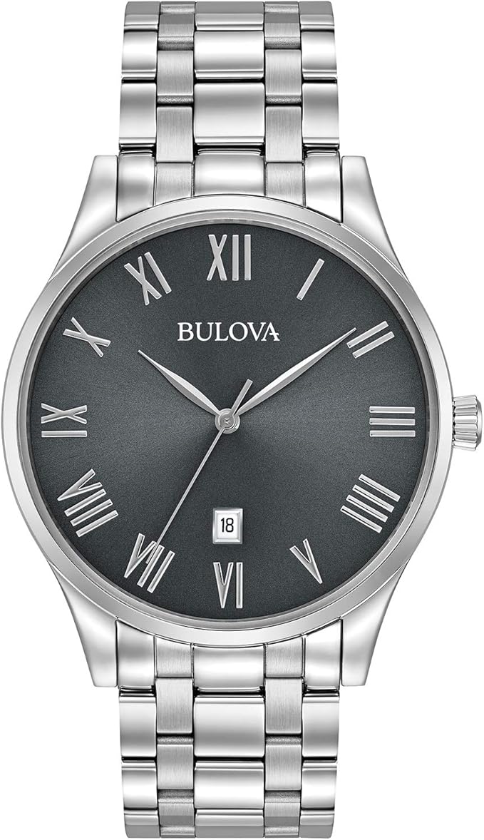 Bulova Men's Classic Stainless Steel 3-Hand Date Calendar Quartz Watch, Grey Dial with Roman Numeral Markers Style: 96B261