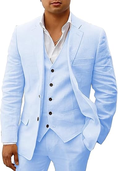 Mens Linen Suit 3 Piece Slim Fit Suit Beach Wedding Suit Prom Tuxedo Causal Linen Jacket Vest Pants Set