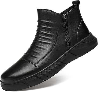 Men's Italian High-top Casual Leather Boots, Side Zipper Waterproof Non-Slip Warm Fur Lined Business Dress Booties Chelsea Chukka Ankle Boots for Men