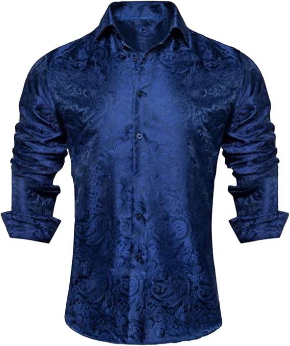 Men Silk Satin Dress Shirts, Long Sleeve Floral Button Up Shirt Casual Regular Fit Shirt for Men Wedding Party Prom Shirt