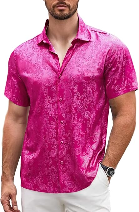 Men's Silk Shirt Paisley Floral Jacquard Short Sleeve Button Down Dress Shirts Formal Casual Wedding Party