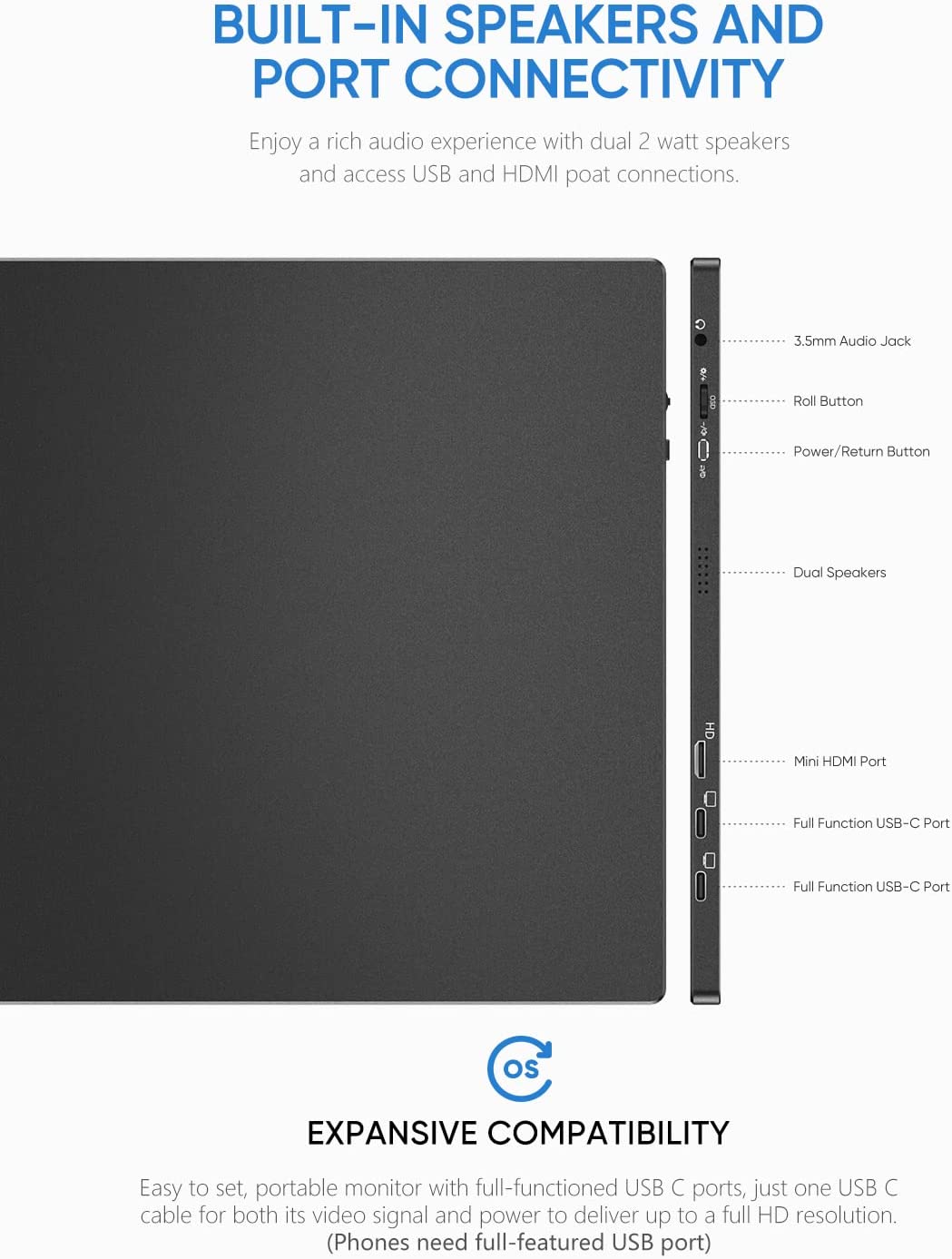 • [Plug and Play] There is no need of app and drivers, you only need one USB-C cable toset the portable monitor for its video signal and power to deliver a full HD resolutionviewing. (Phones need full-featured USB port).