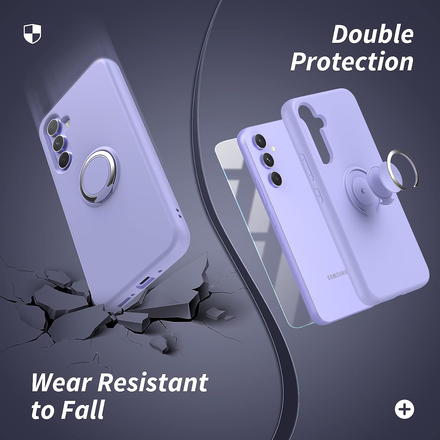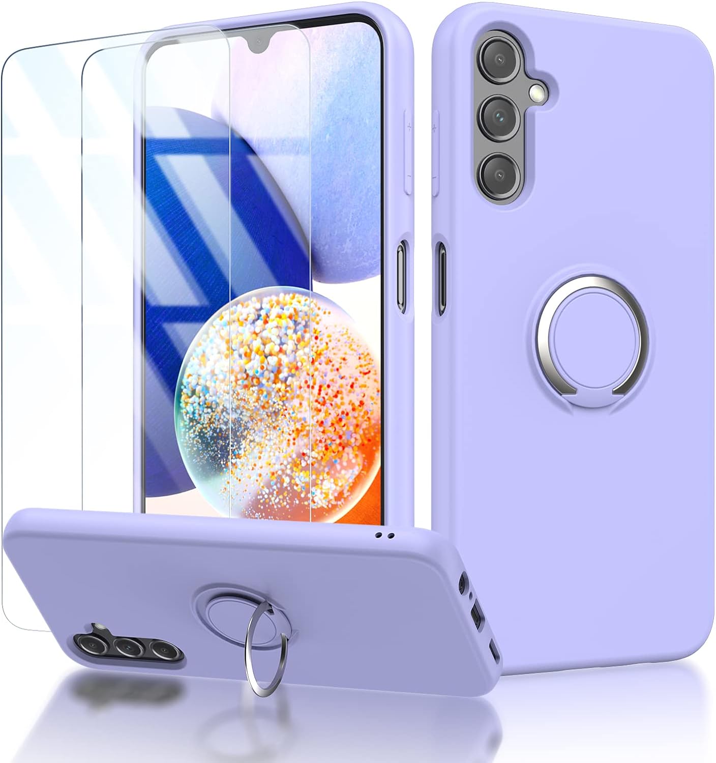 TUNKARMOR for Samsung Galaxy A14 5G Case: with 2 Pack Tempered Screen Protector & Built in 360° Adjustable Ring Kickstand Shockproof Protection Soft TPU Silicone Phone Cover (Purple)