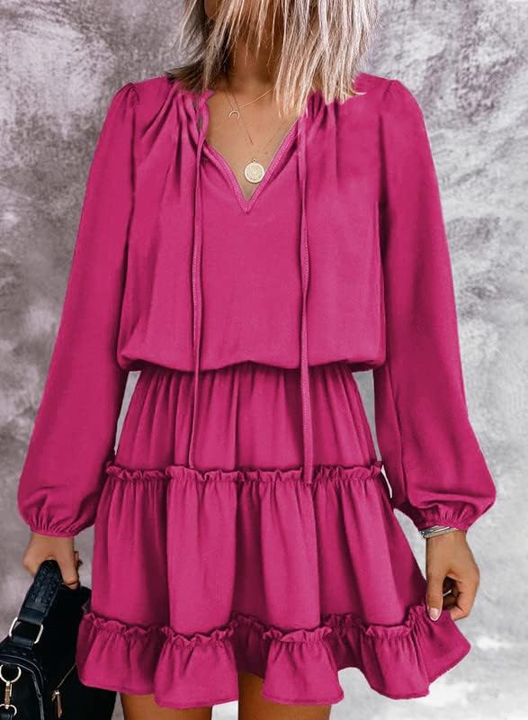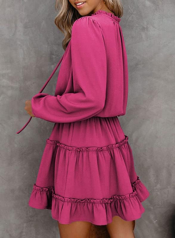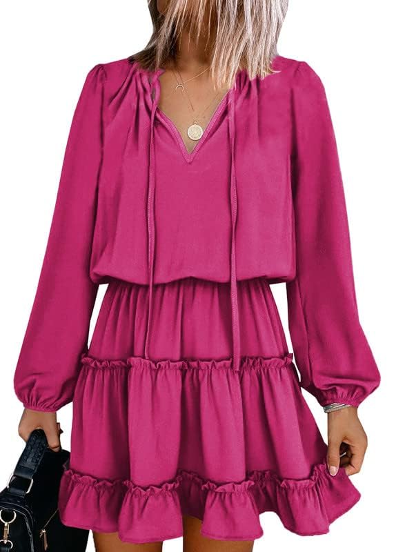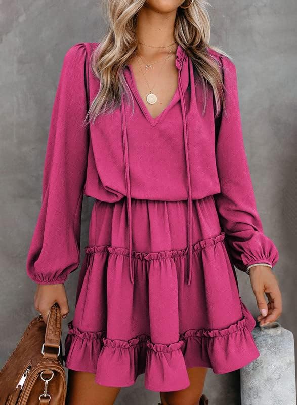 Dokotoo Womens Cute Spring Sexy Deep V Neck Ruffle Chiffon Lantern Long Sleeve Elegant Boho Bohemian Hawaiian Flowy Mini Short Skirt Dresses for Women Casual Spring 2024 Rose US 12 14