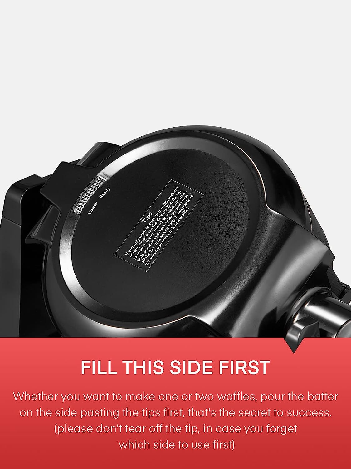 • 【FILL THIS SIDE FIRST】 Whether you want to make one or two waffles, pour the batter on the side pasting the tips first, that's the secret to success. (Please don’t tear off the tip, in case you forget which side to use first.)