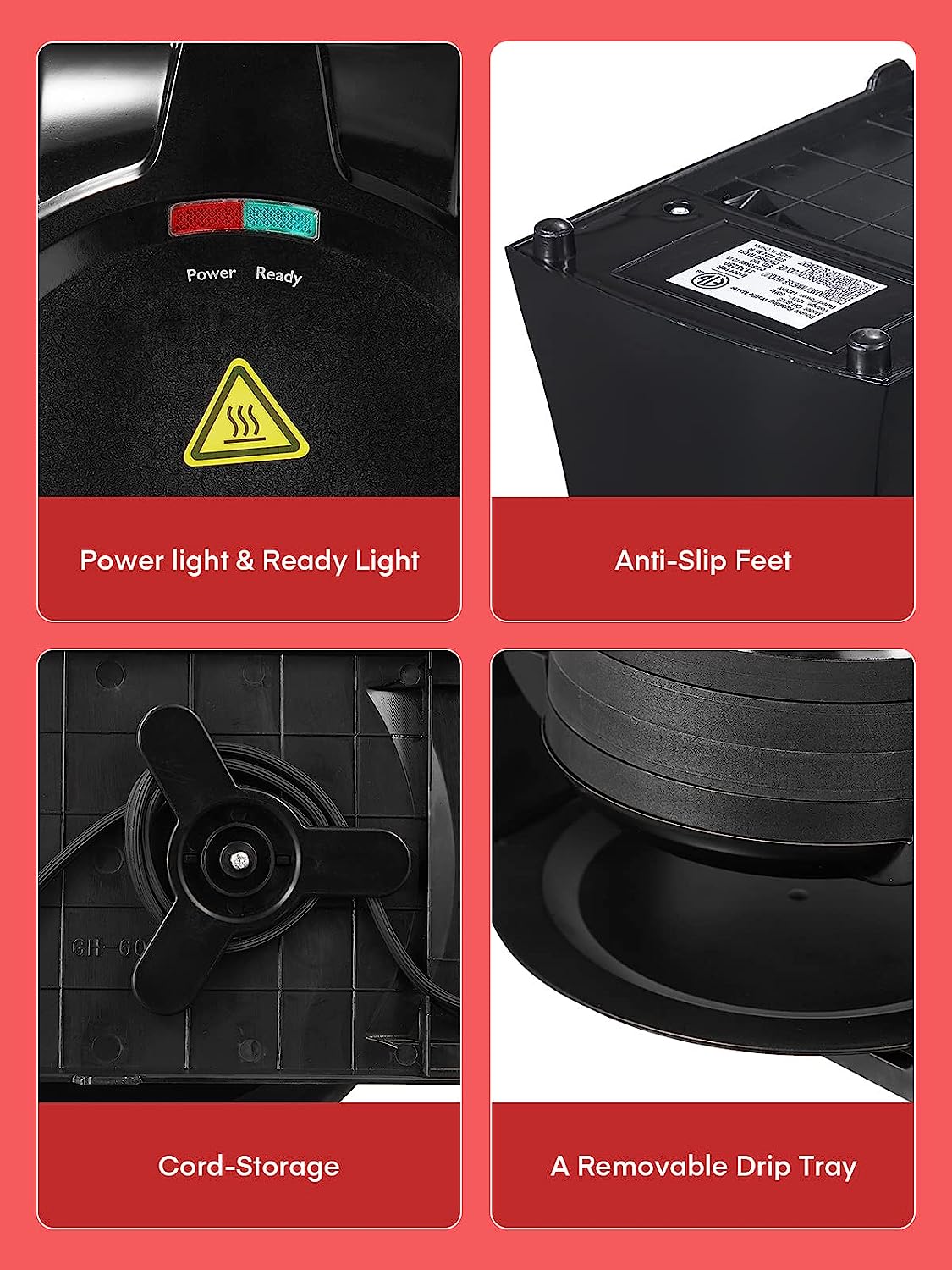 • 【GOOD PRODUCT IN THE DETAIL】 Double indicator lights tell you when power is on and the timing to add batter; the cool-touch handles are easy to hold, lock, and flip; the nonstick interior and the drip tray make for an easy clean-up.