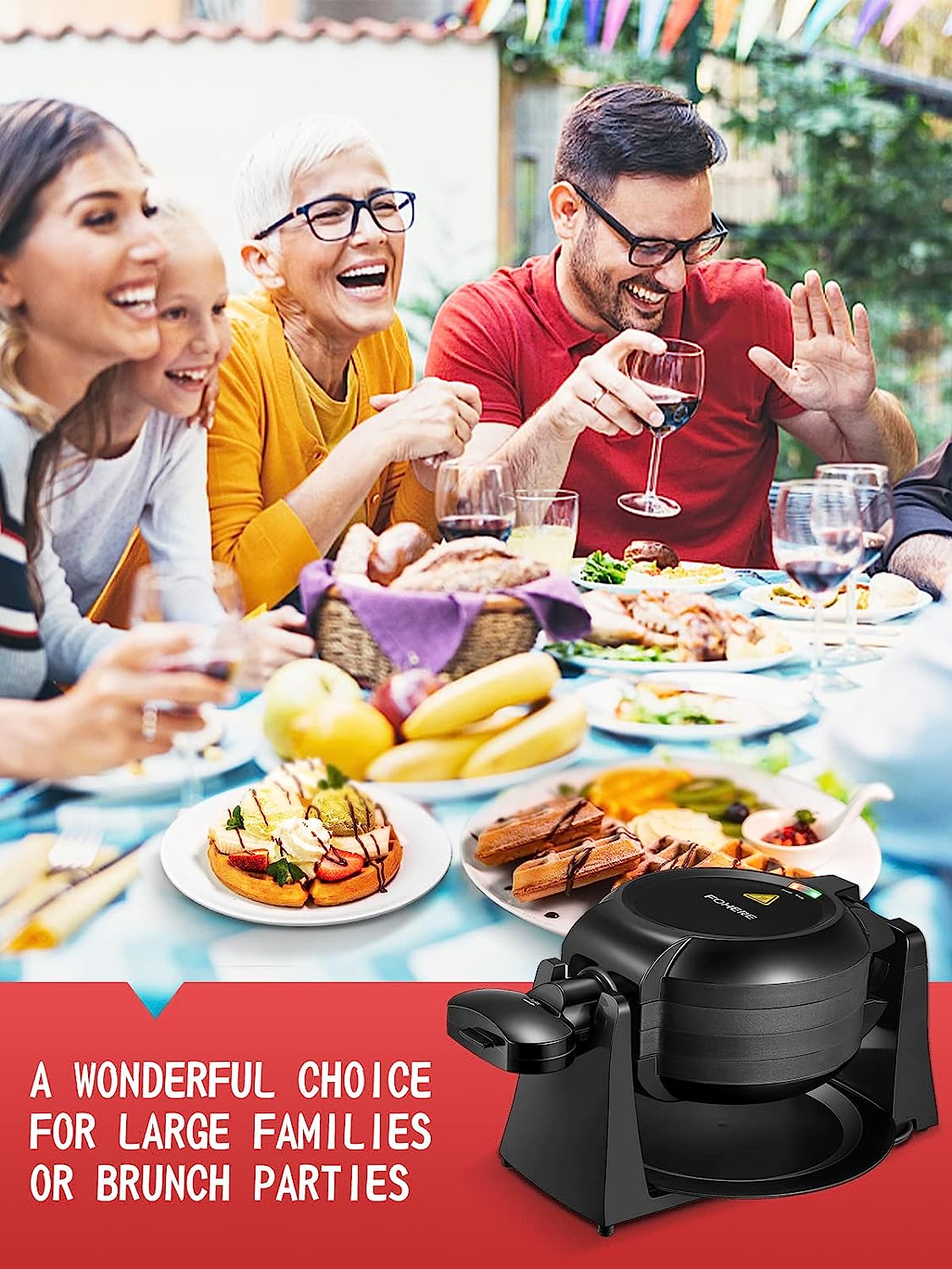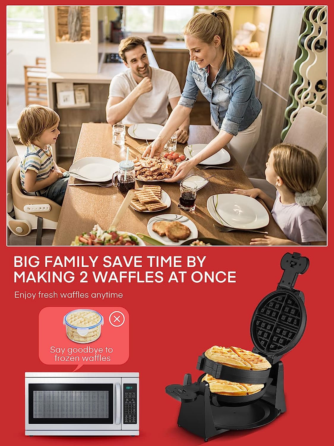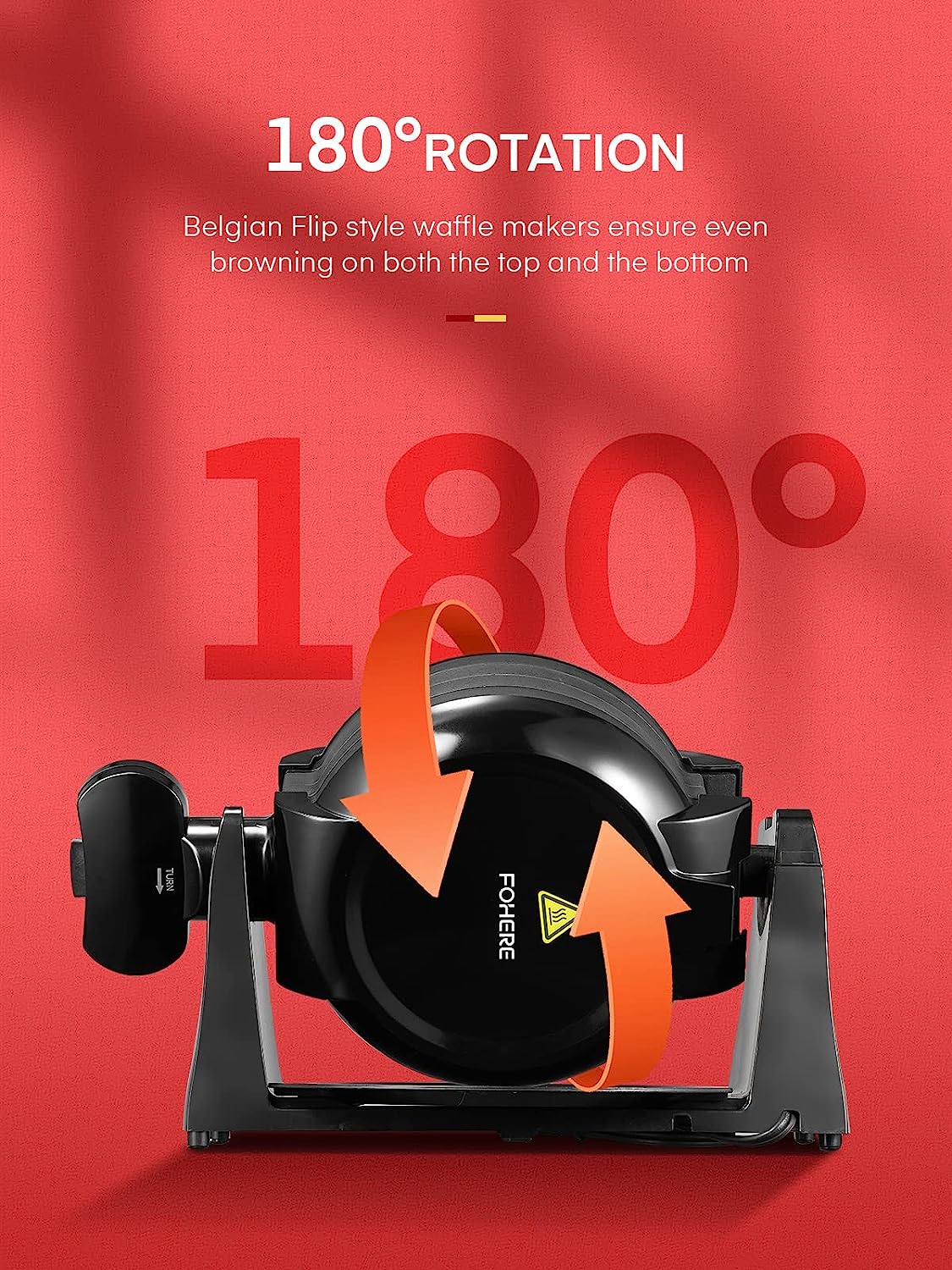 • 【180° ROTATION COOKING SYSTEM】 The special cooking system lets gravity do the work to churn out ideal, fluffy waffles. 180° flip-style waffle makers ensure batter to be equally distributed for evenly cooked, fluffy waffles, browned on both the top and the bottom with no bald spots.