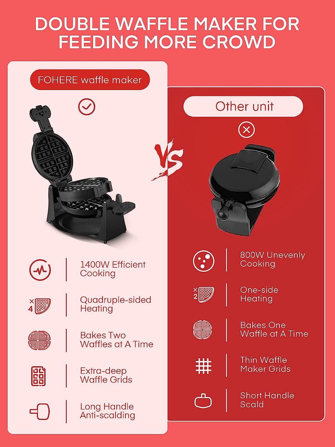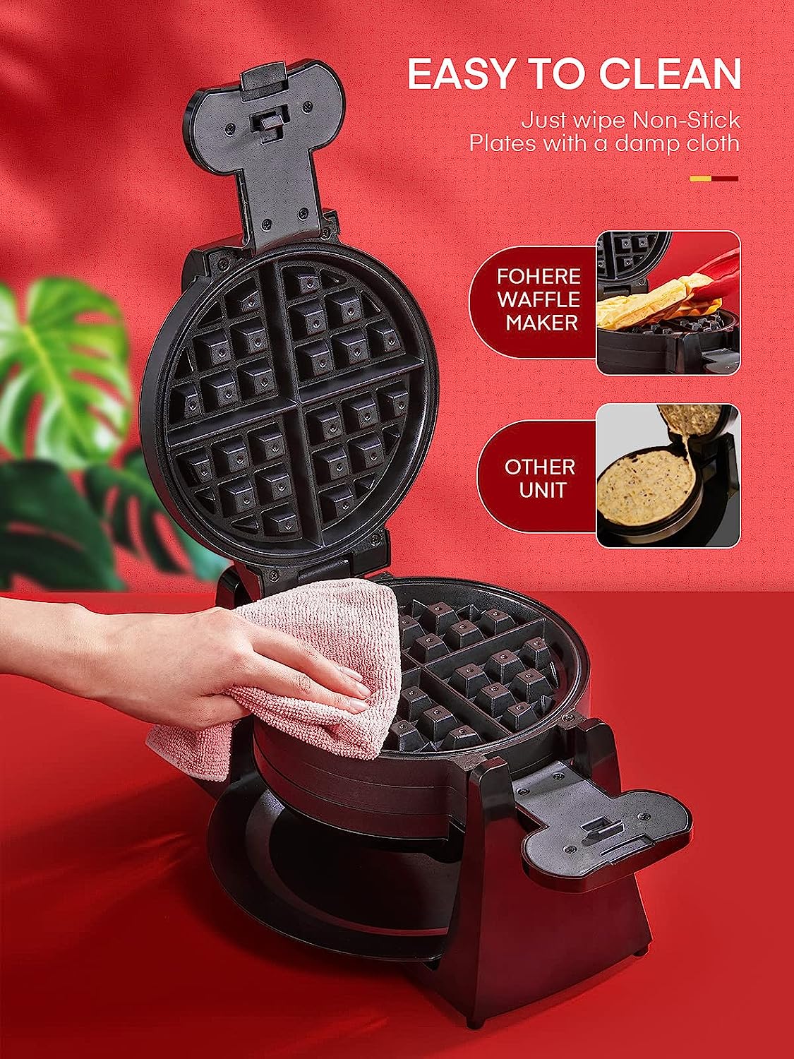 • 【EASY TO CLEAN & TRY A SMALL AMOUNT OF BATTER FIRST】It is a matter of trial and error to get the desired consistency, so try a small amount of batter first in case it overflows. FOHERE is easy to clean only with a damp cloth, Durable nonstick coating releases the waffles easily after cooking without sticking or tearing.