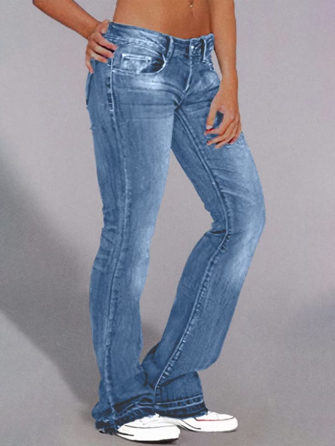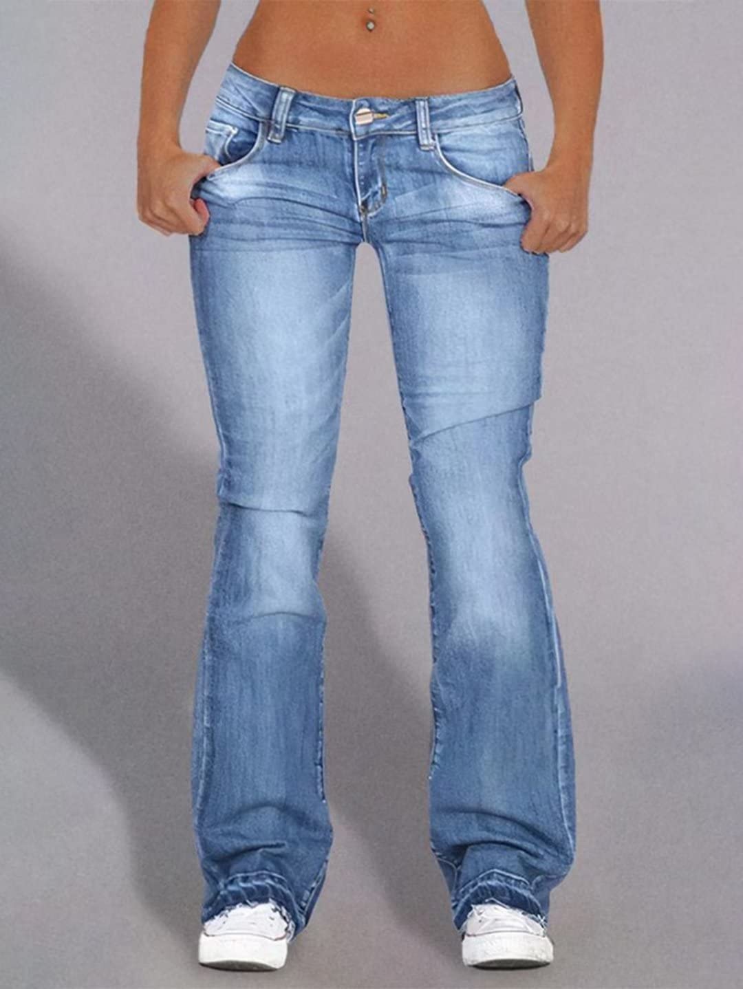 Flamingals Butt Lifting Low Rise Flamingo Jeans for Women Trendy Stretch Wide Leg Pants Denim Mid Blue L