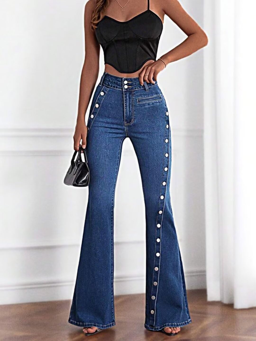 Flamingals Women's Button Detail High Waist Flare Casual Jeans Mid Blue M
