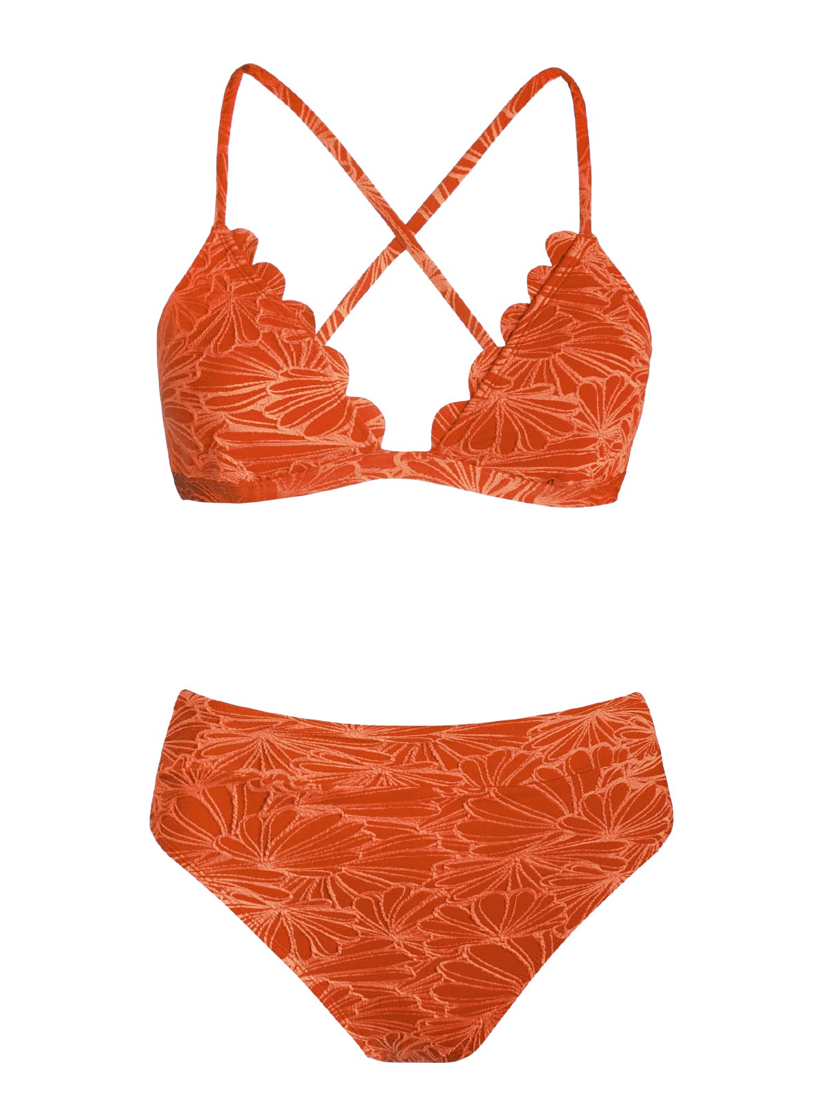 CUPSHE Bikini Set for Women Bathing Suit High Waisted Scalloped V Neck Two Pieces Swimsuit, M Coral Orange