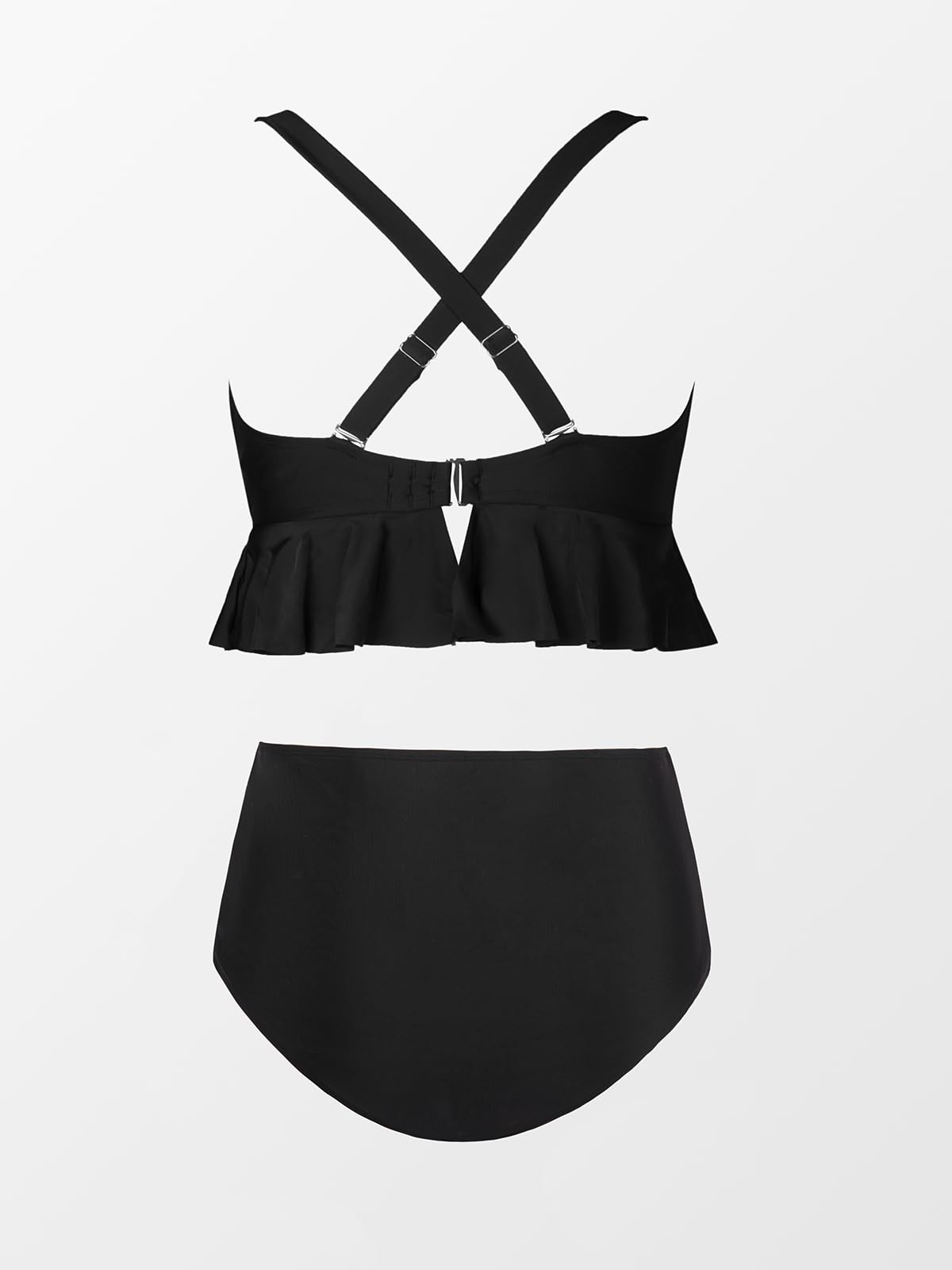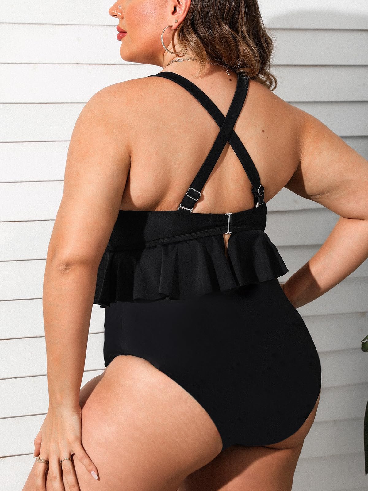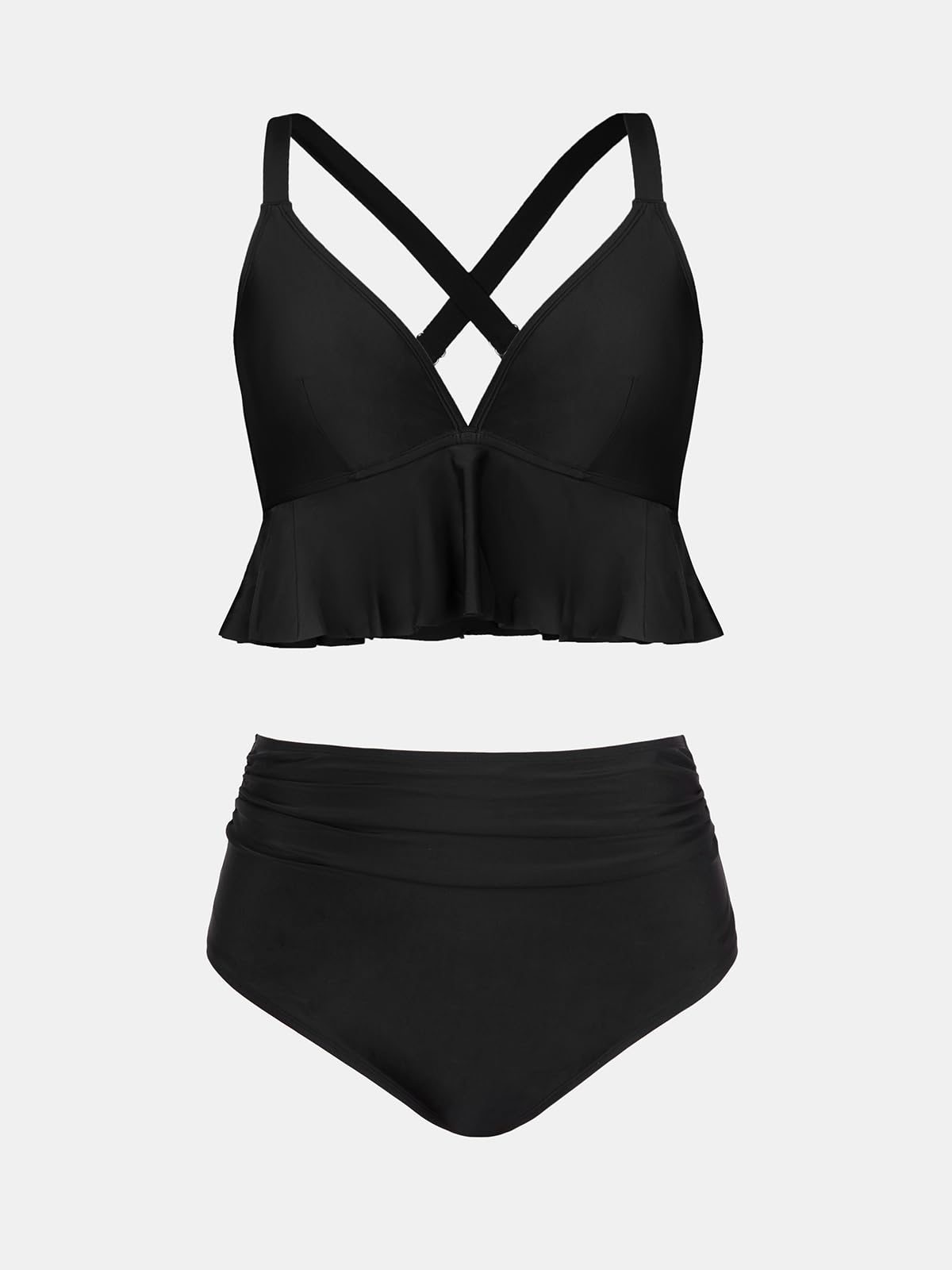 • Design: A Perfect Staple to Add to Your Summer Wardrobe, This V Neck Plus Size Bikini Set with Adjustable Wide Straps Features Flowy Ruffle Hem and Crisscross Self Tie Back, While the Matching High Waisted Ruched Bottom Provides More Tummy Control.