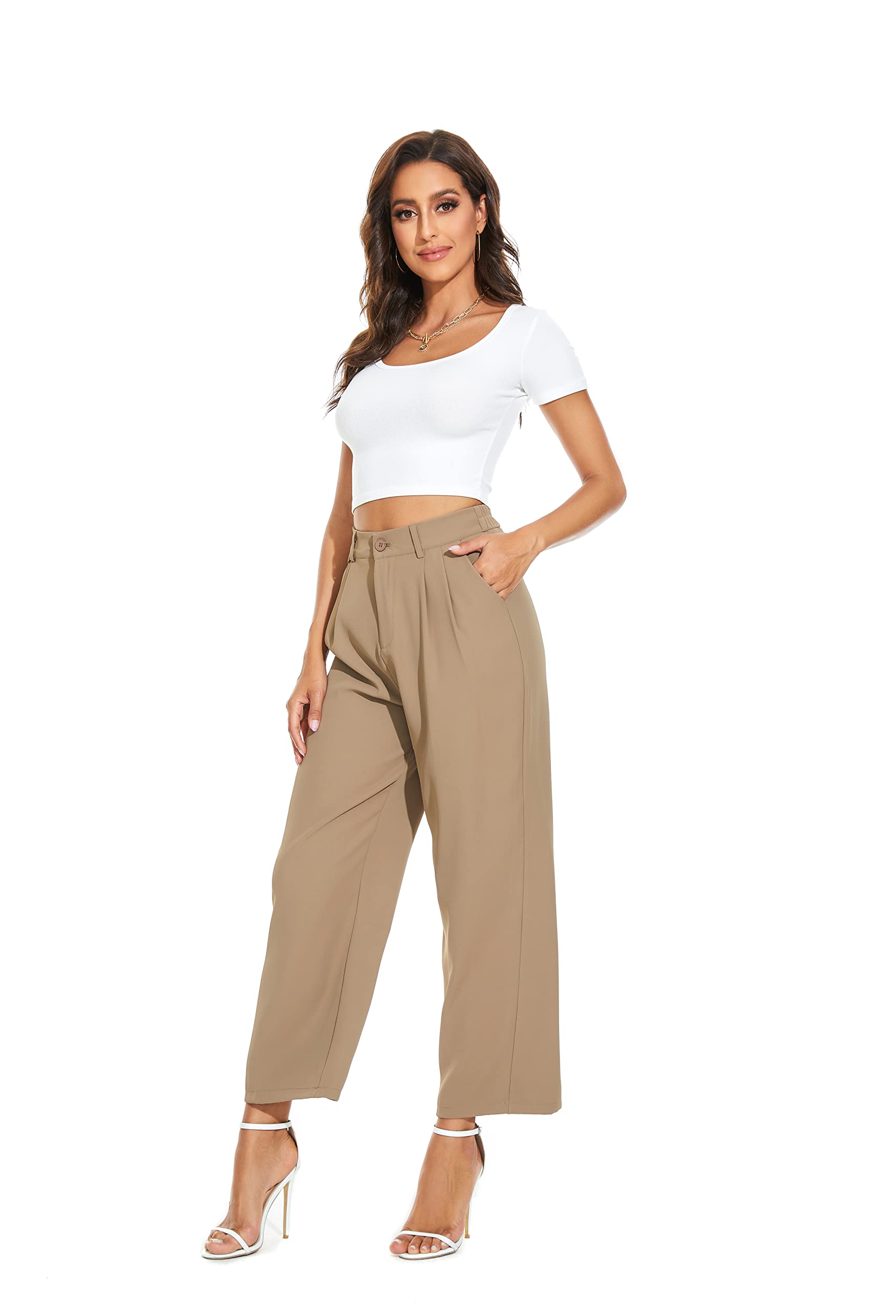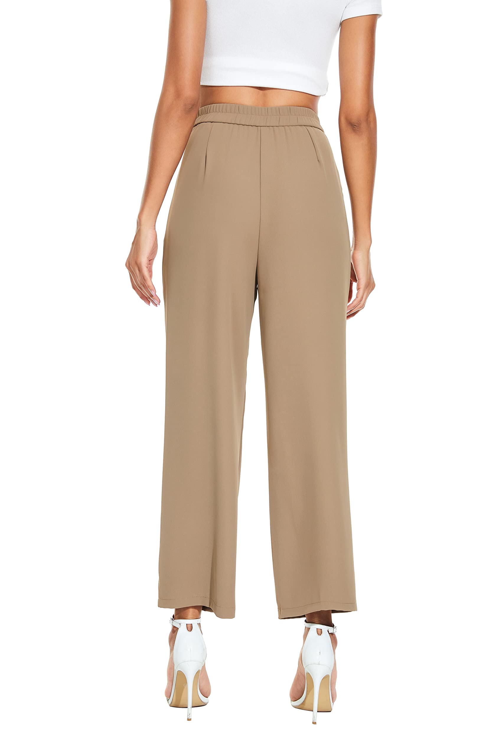 Details: Details : Back Elastic Waist, Pleated Front, Loose Fit Season : Spring/Summer Waist Line : High Waist Leg Type : Wide Leg Closure Type : Zipper Length : Long Pattern Type : Solid Fit Type : Regular Composition : 95% Polyester, 5%Spandex Stretch : Yes Material : Woven