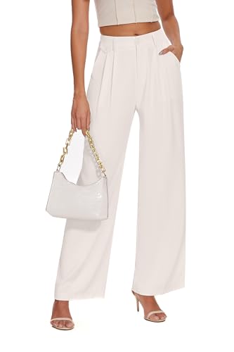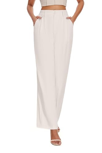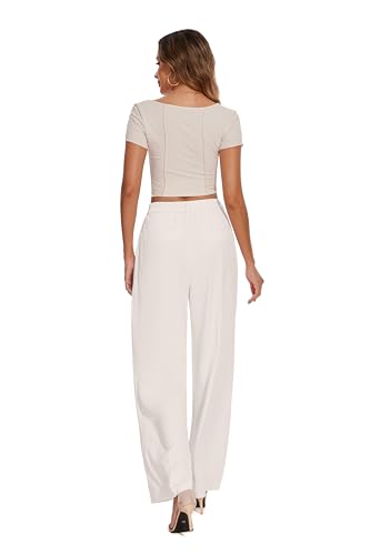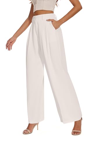 FUNYYZO Women Loose Pleated Front Long Pants Wide Leg Trousers Solid Causal Dressy Beige
