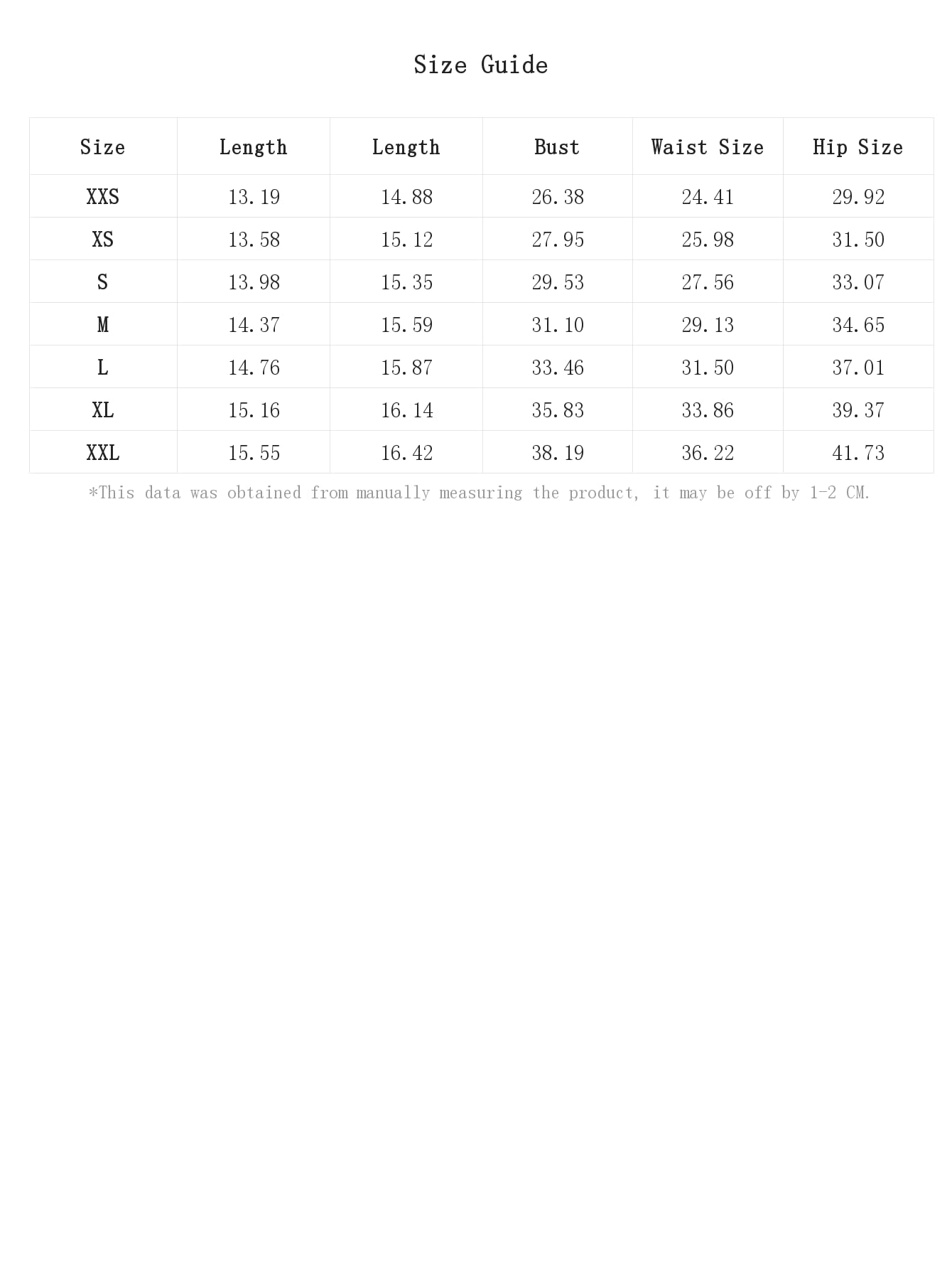 XL:Hip Size:39.4IN,Length:15.2IN,Waist Size:33.9IN,Bust:35.8IN,Length:16.1IN
